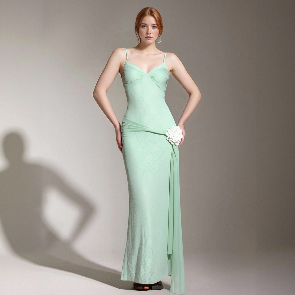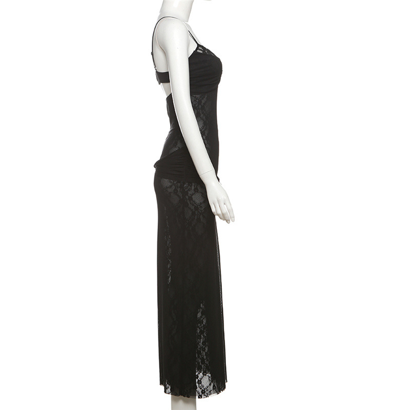 Sexy mesh hollow suspender dress slim fit backpack hip slit high-end dress long skirt