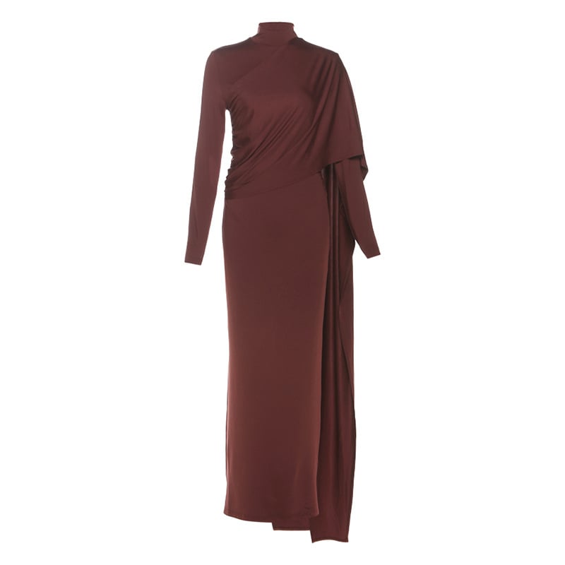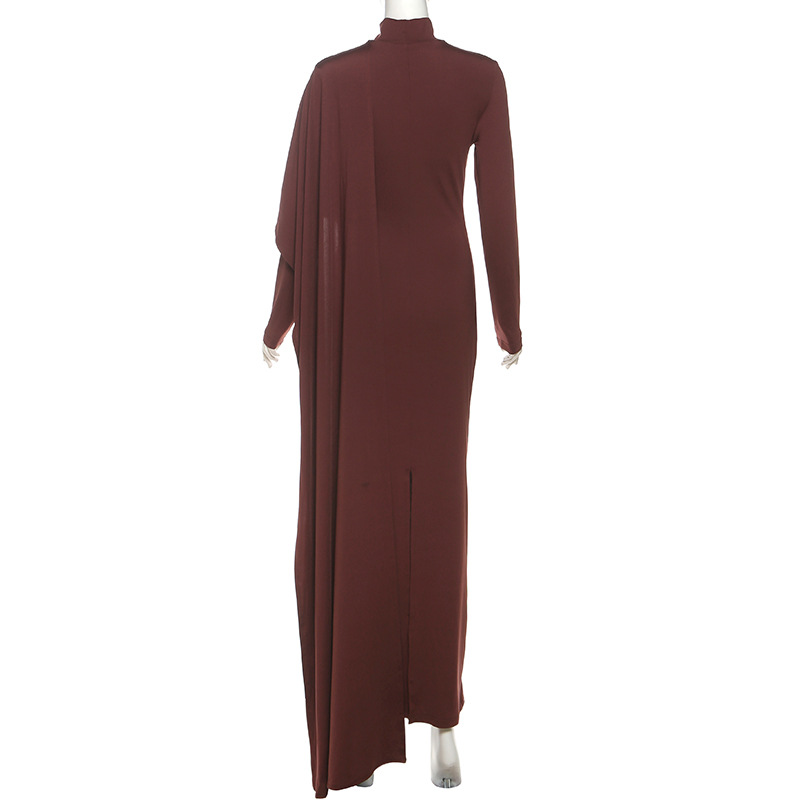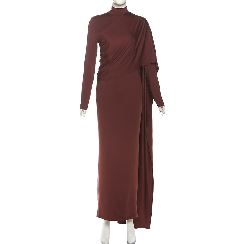 Solid color high collar long sleeve waist hip-hugging ribbon dress