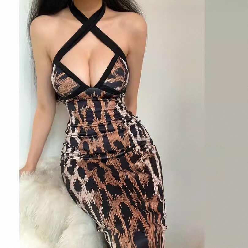 Sexy leopard print fitted hot girl style sleeveless halter neck slit dress