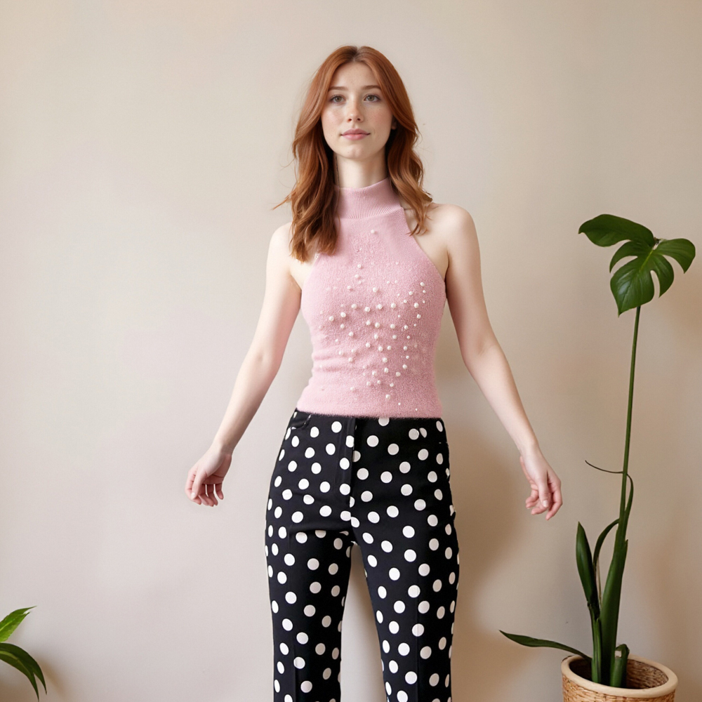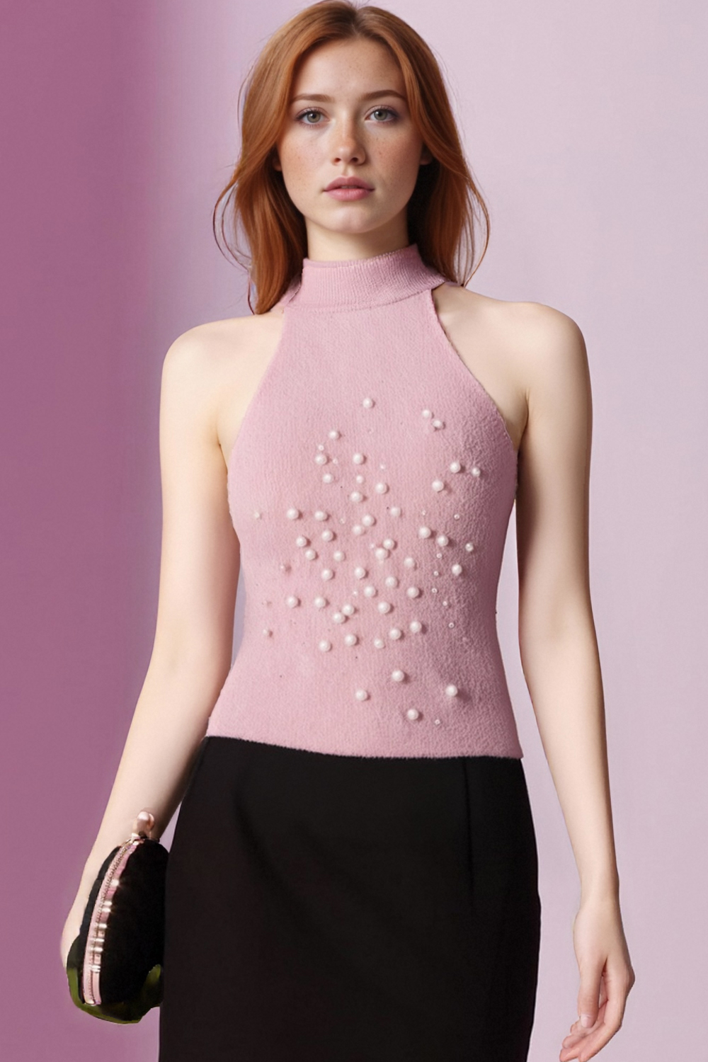 Halter neck knitted vest with faux pearls and faux fur effect