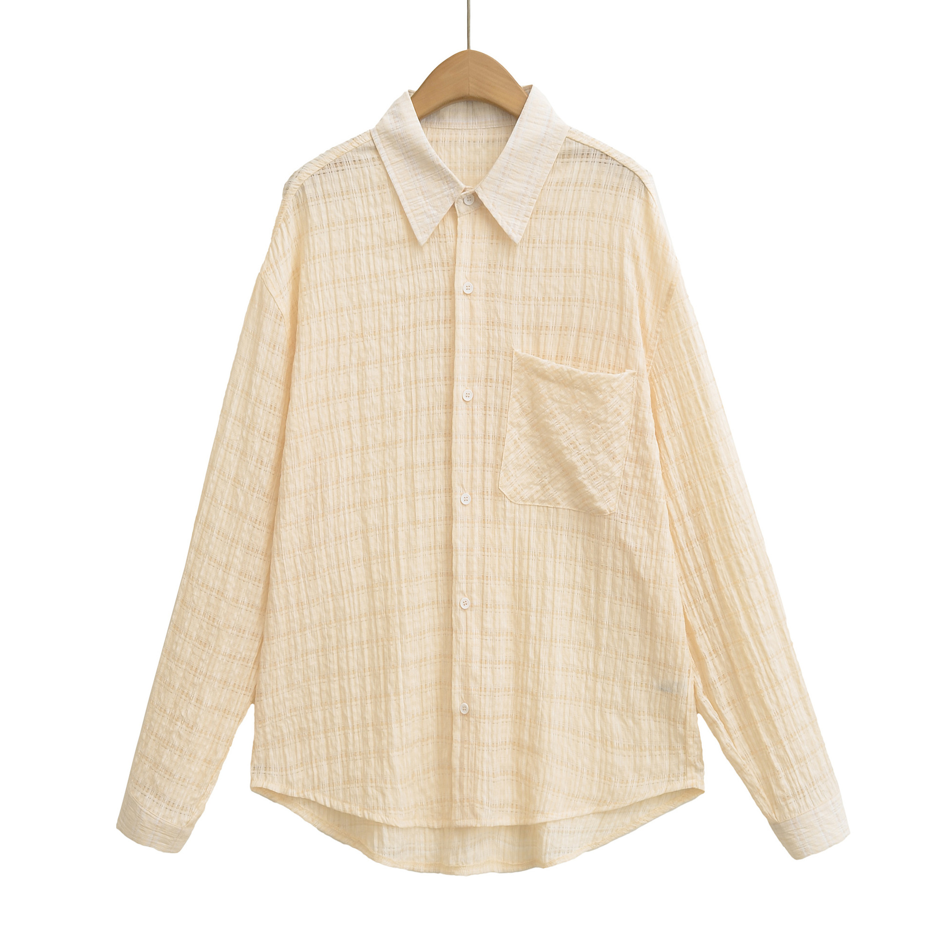 Workwear style mid-length top with a slightly transparent loose casual shirt