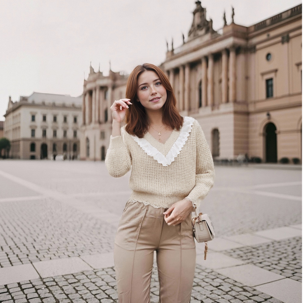 Lace Panel V-Neck Lace Pullover Knit Sweater