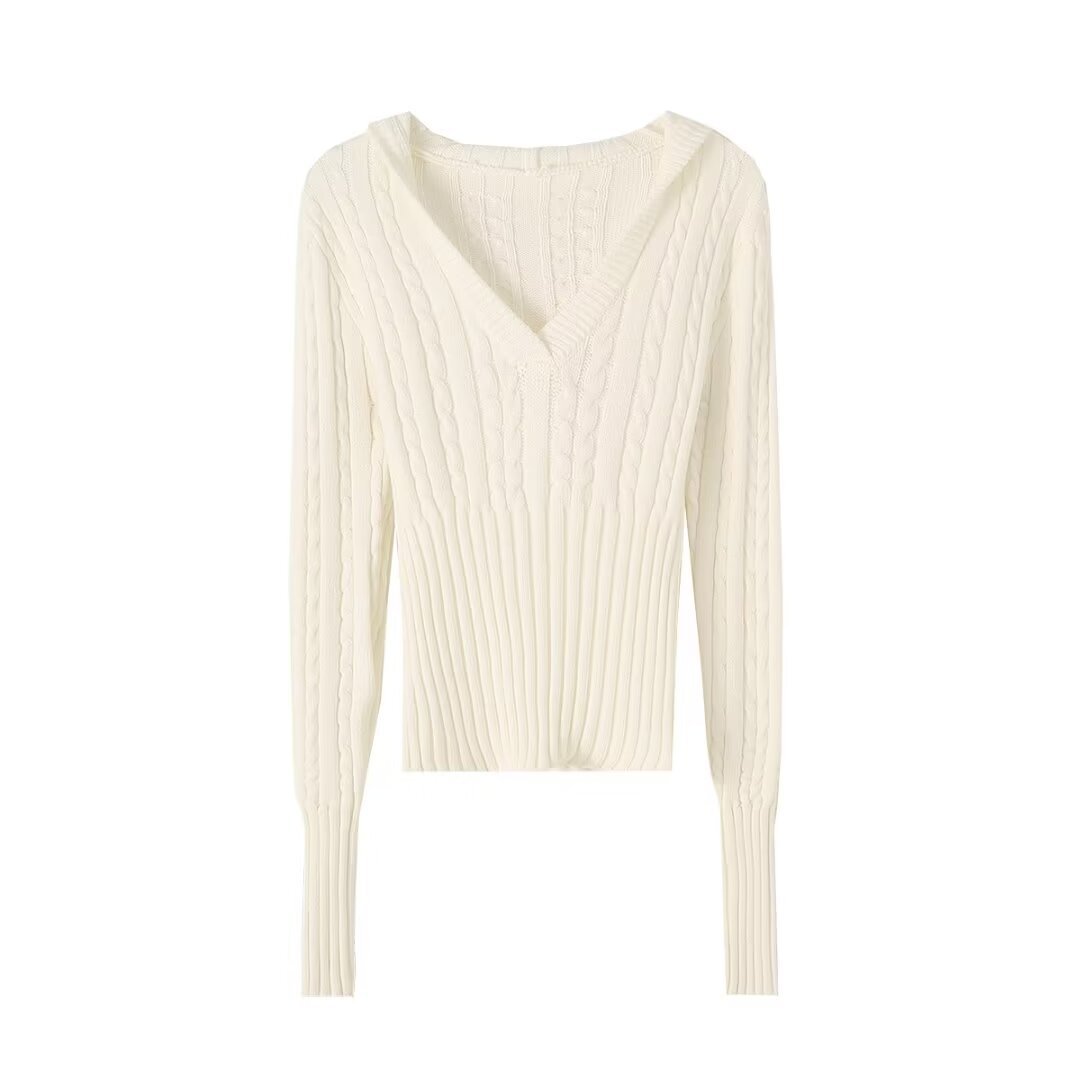 V-neck hooded pullover ribbed cable knit casual sweater