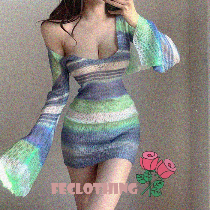 Teal gradient stripe open back round neck ruffled sleeve knit dress