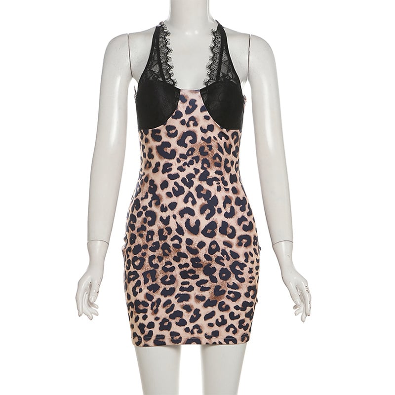 Sexy leopard print contrast color stitching lace V-neck backpack hip dress