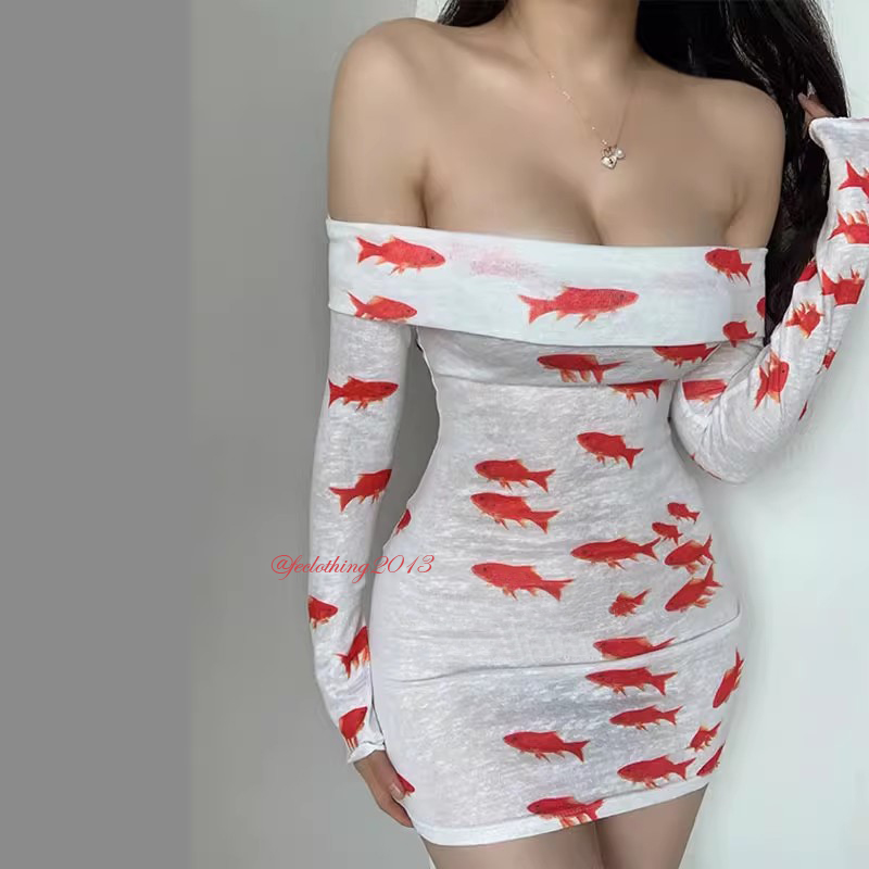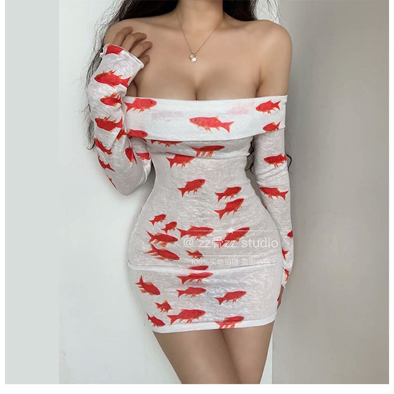 Sexy one-shoulder goldfish print long-sleeved dress