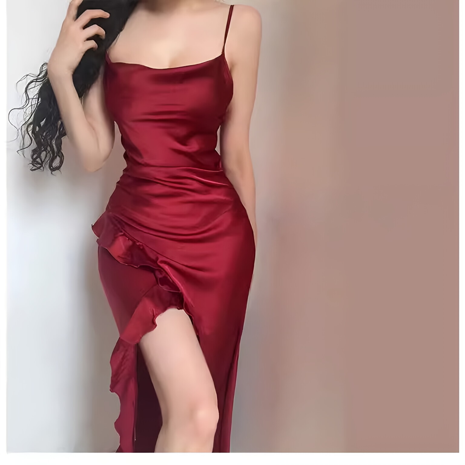 Sexy suspender nightgown with ruffled hem and slit pajamas and home wear