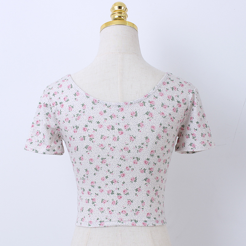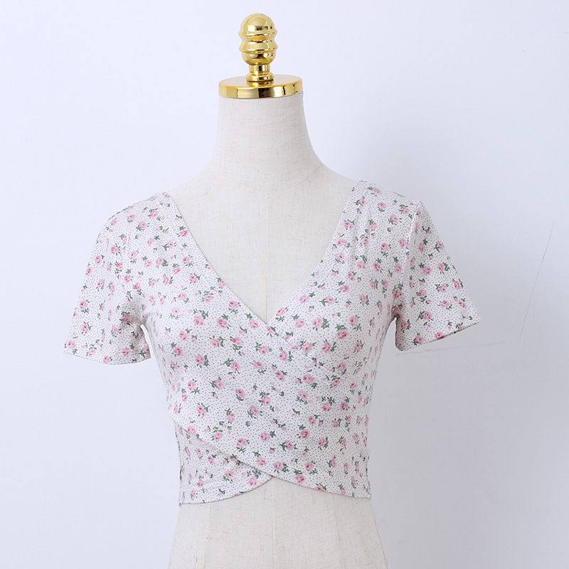 Vintage floral cross v-neck skinny slim short navel T-shirt