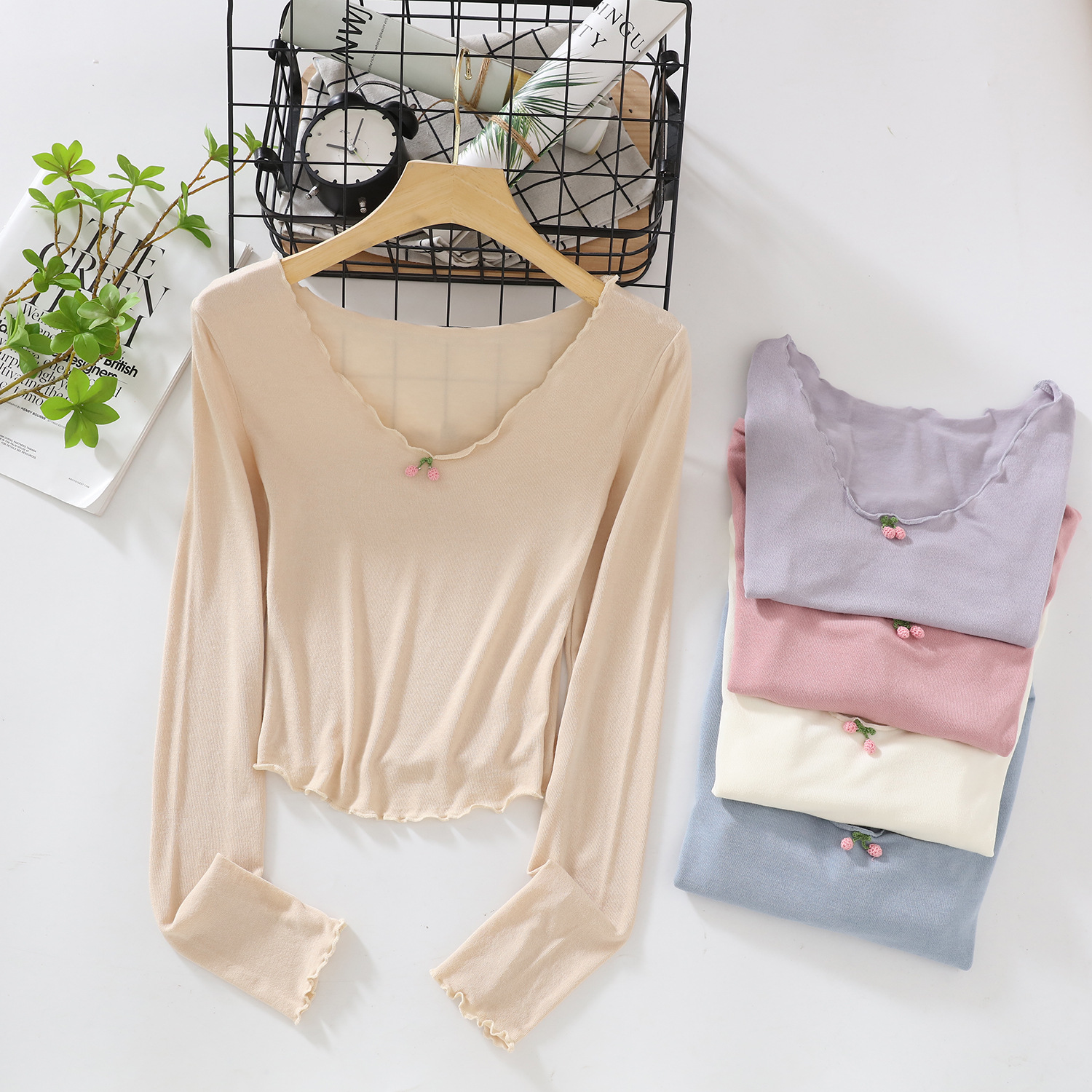 Cherry Soft Sun Protection Top Fungus Edge U-Neck Slim T-Shirt