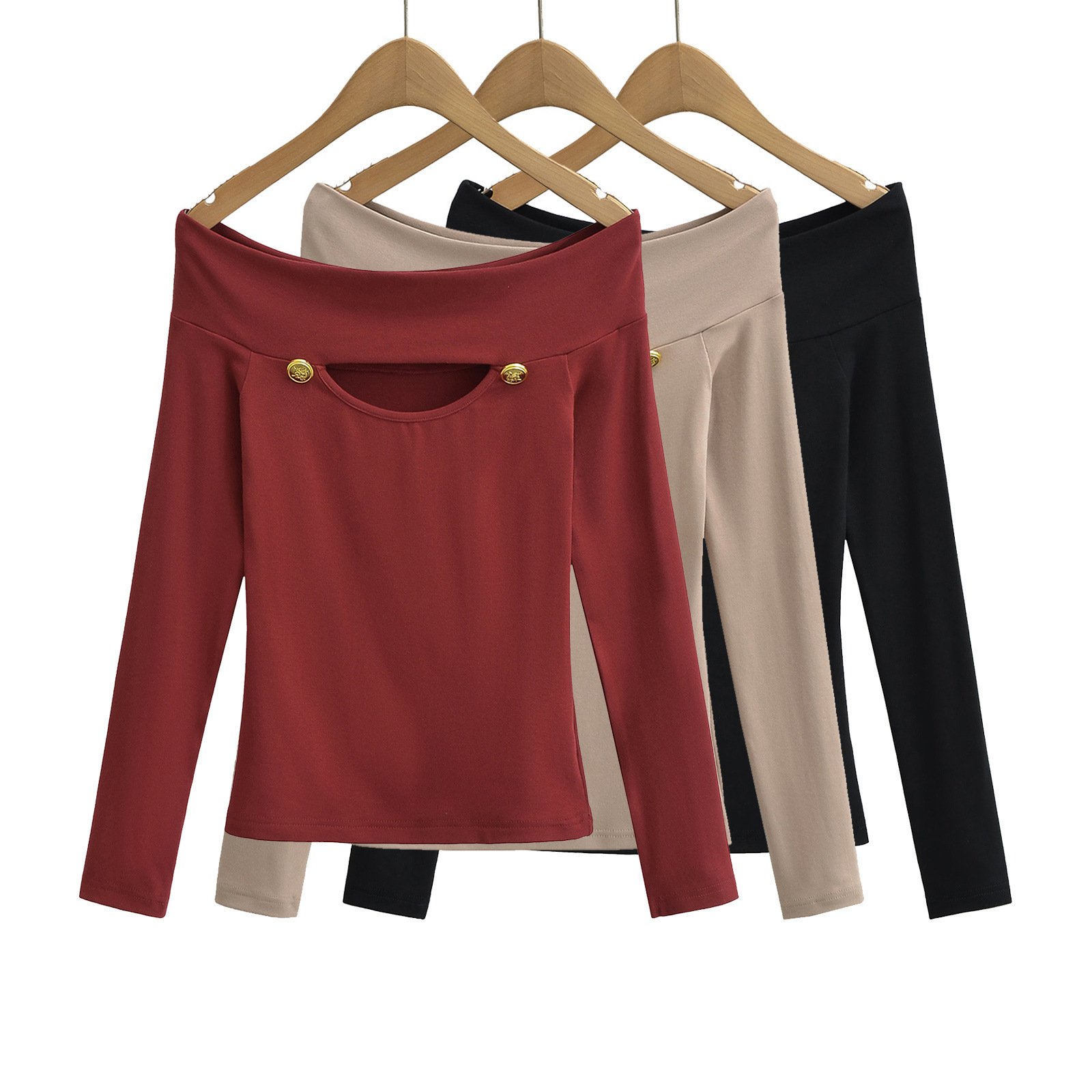 Sexy one-shoulder hollow air quality long-sleeved tight top T-shirt