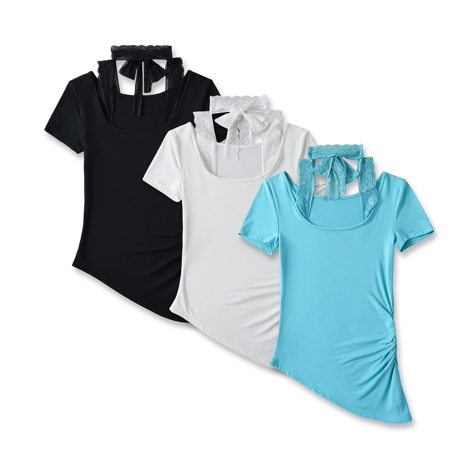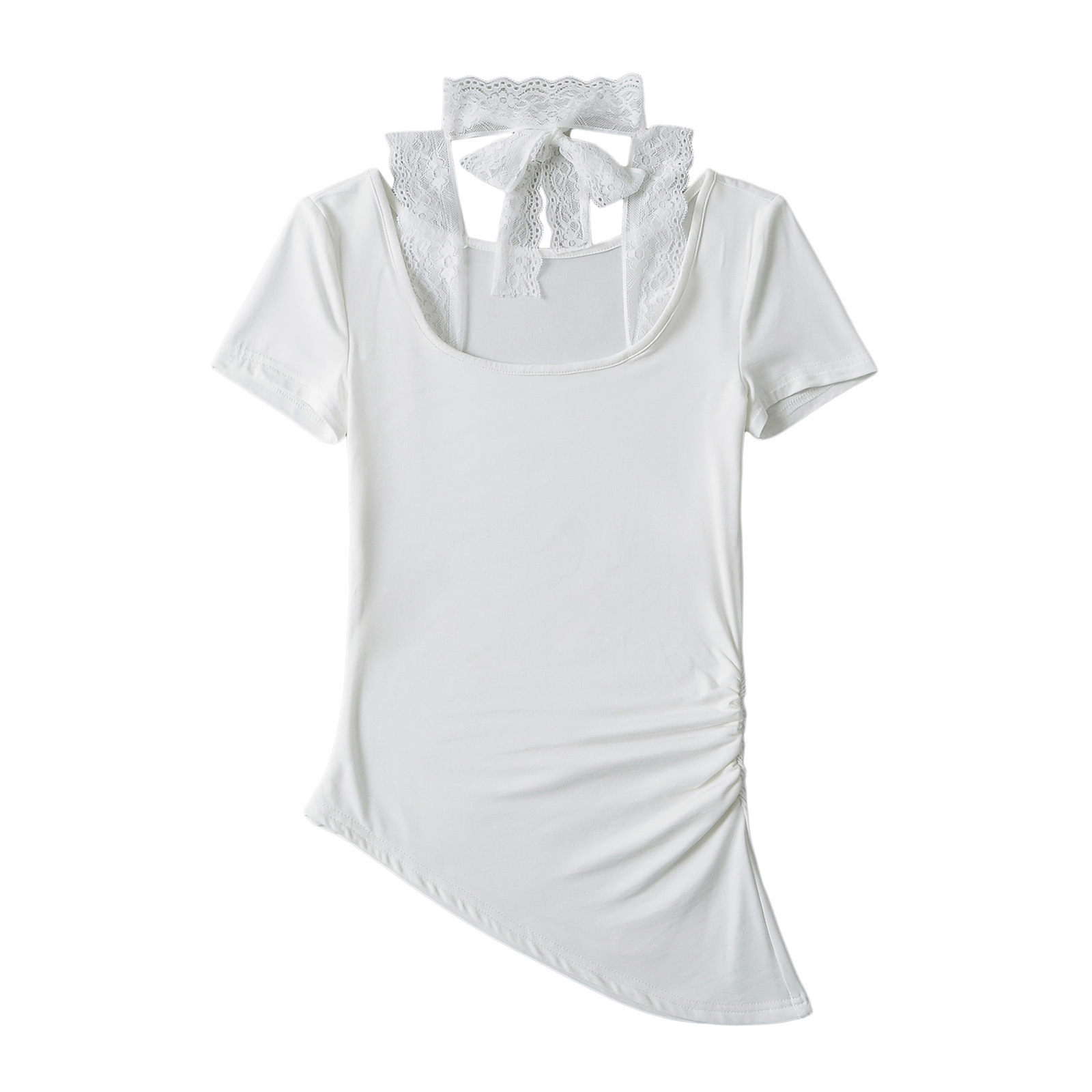 Lace patchwork mask T-shirt irregular top hot girl tight waist short sleeve