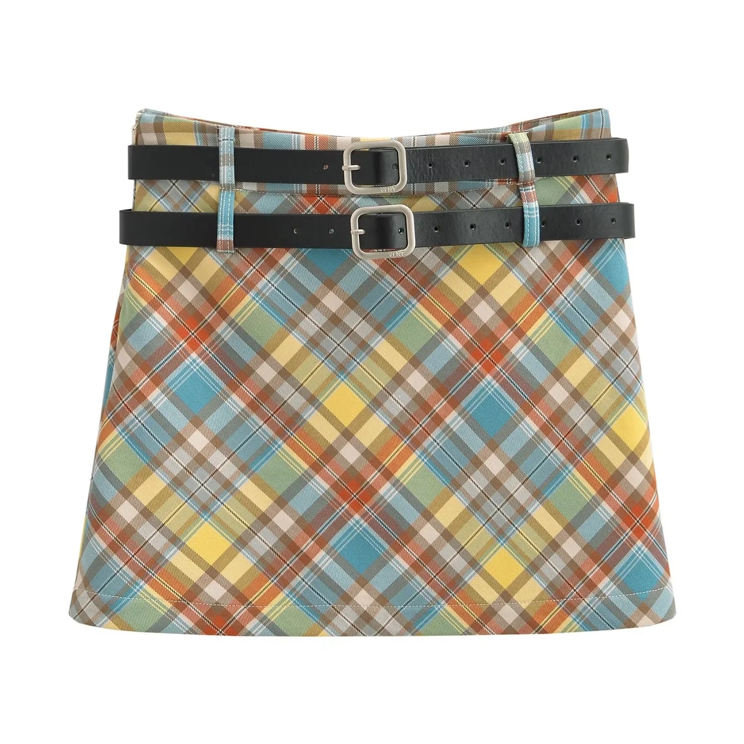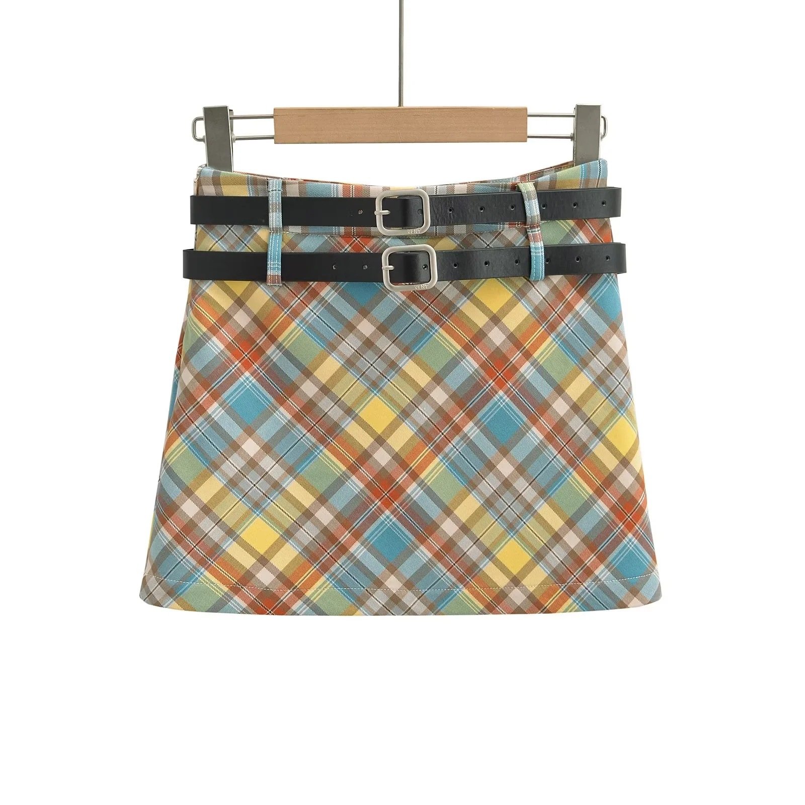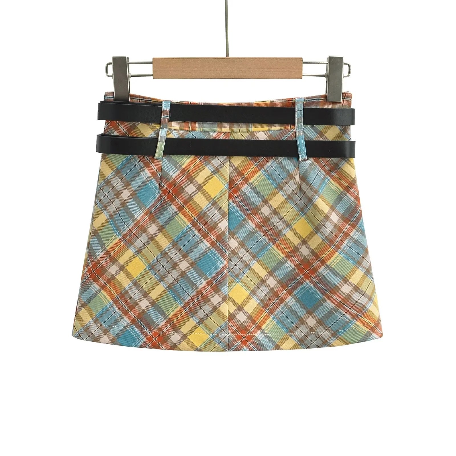 Plaid double belt A-line skirt