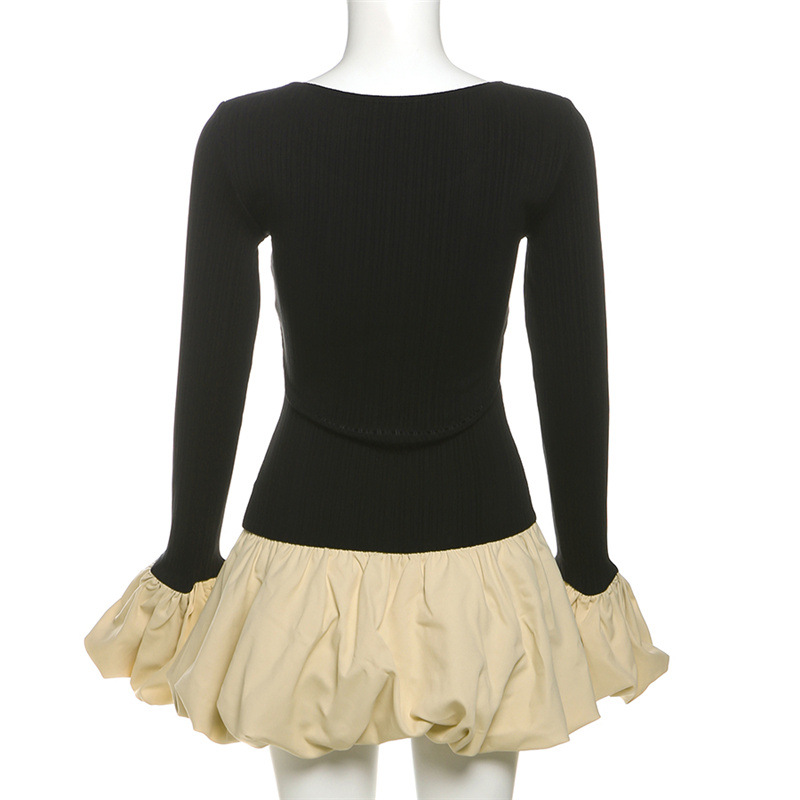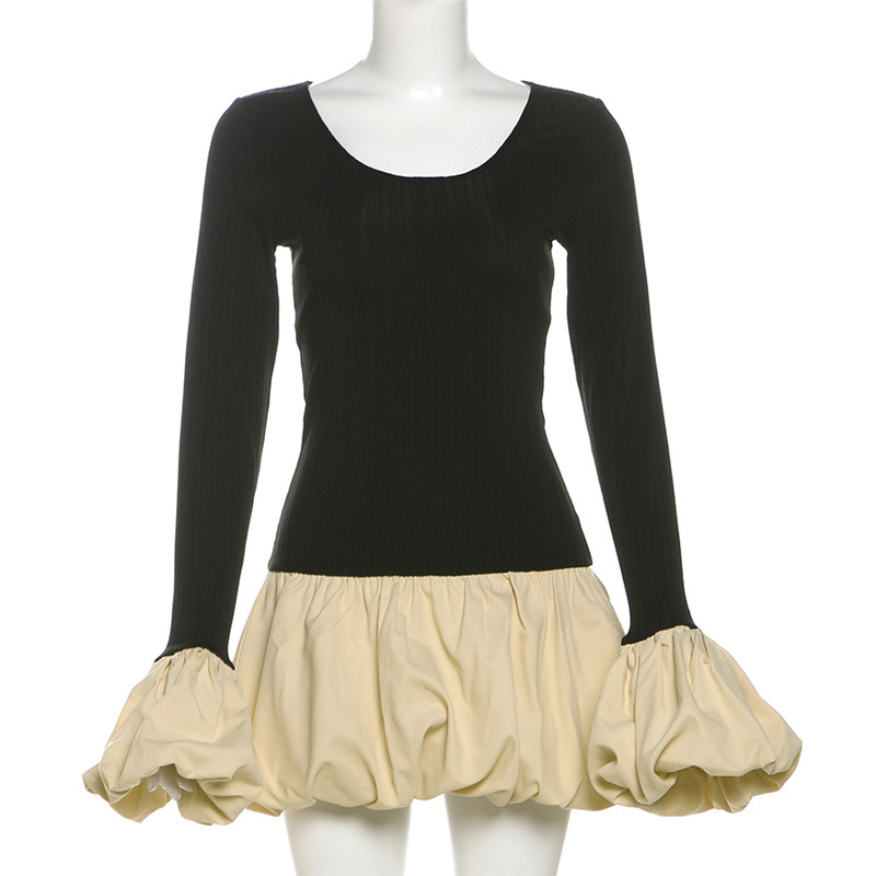 Contrast Color Slim Fit Tutu Waist Long Sleeve Dress
