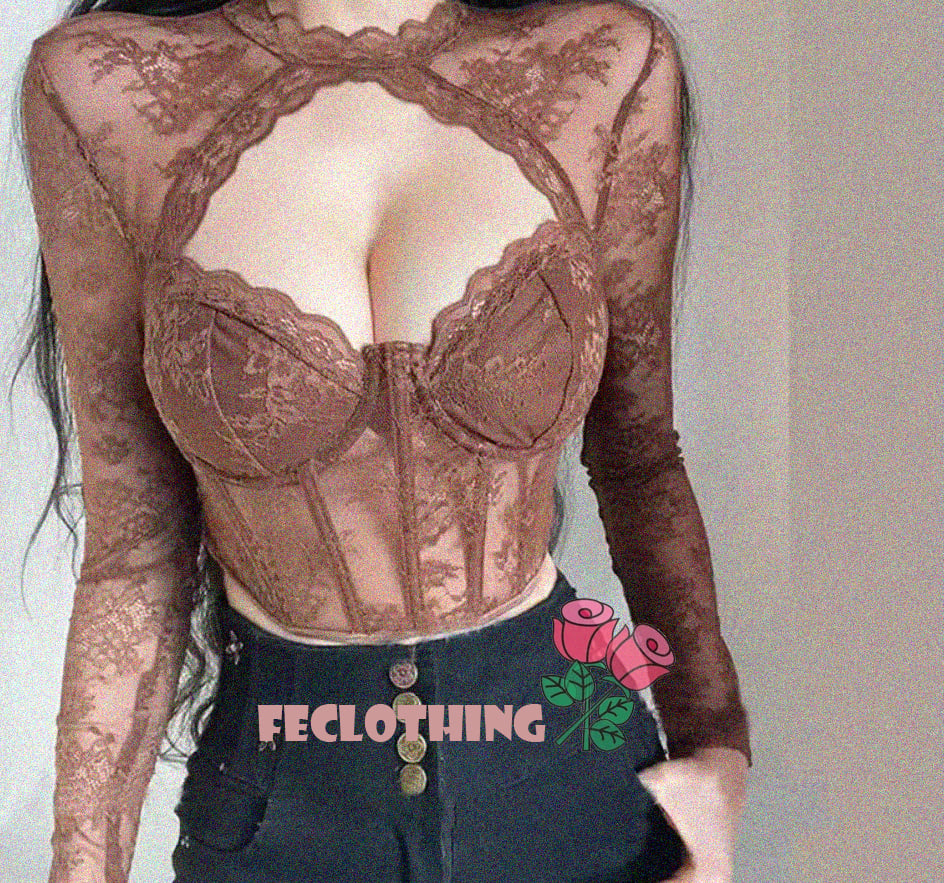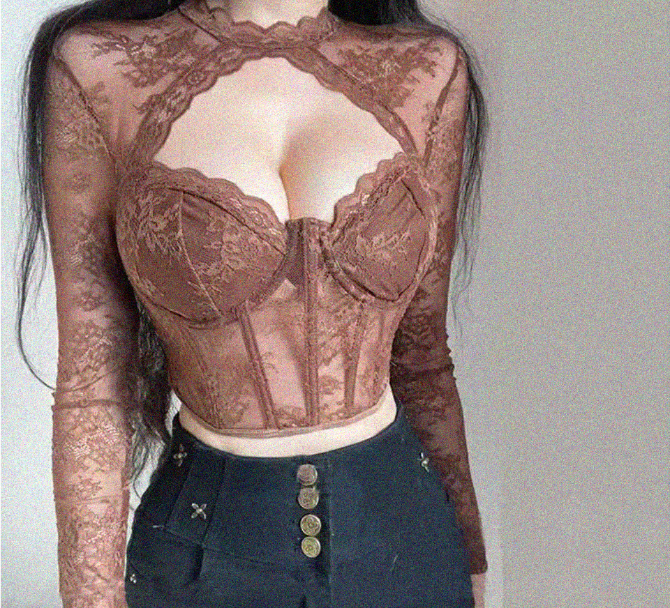 Sexy Flower Lace Hollow Round Neck Long Sleeve Wire Ring Herringbone See-through Top