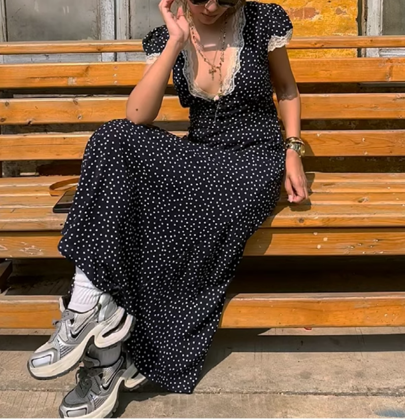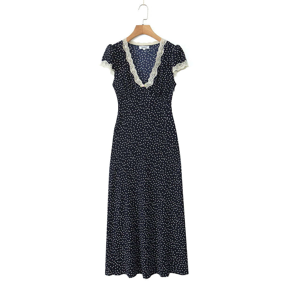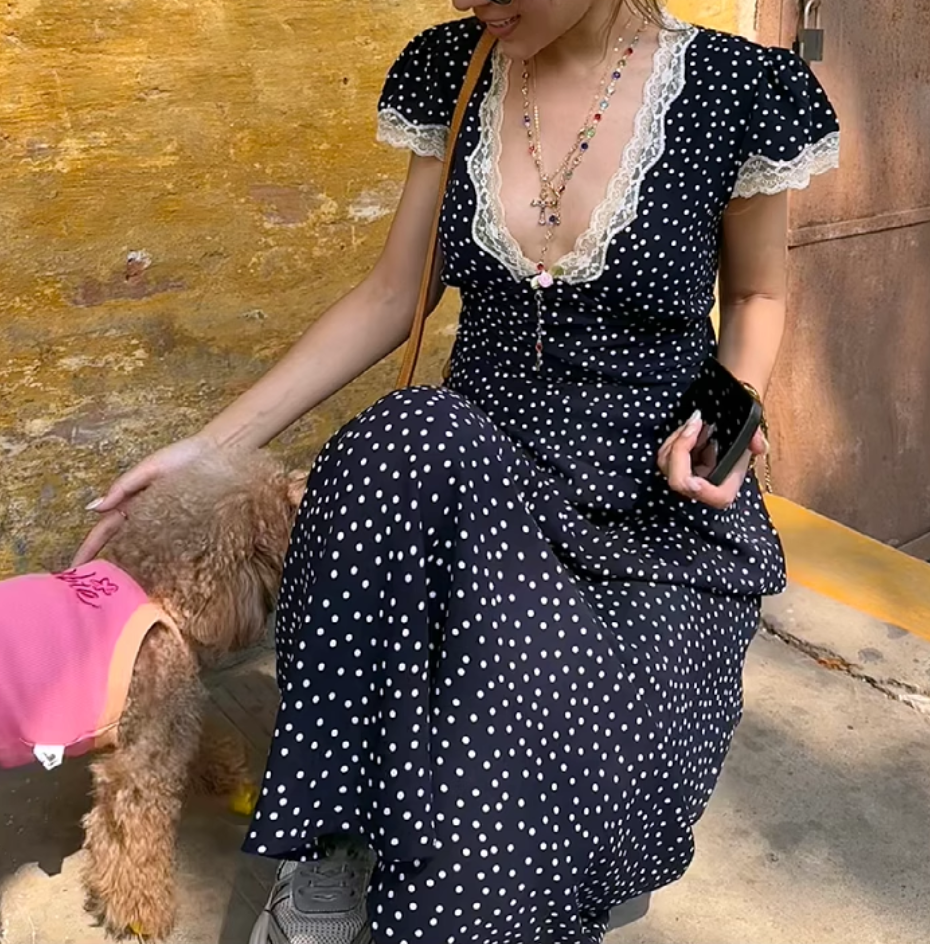 Lace patchwork polka dot print V-neck pastoral style hip-wrapped long skirt