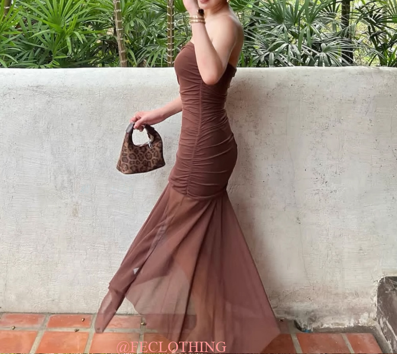 Sexy tube top sleeveless pleated slim fit stitching mesh long dress