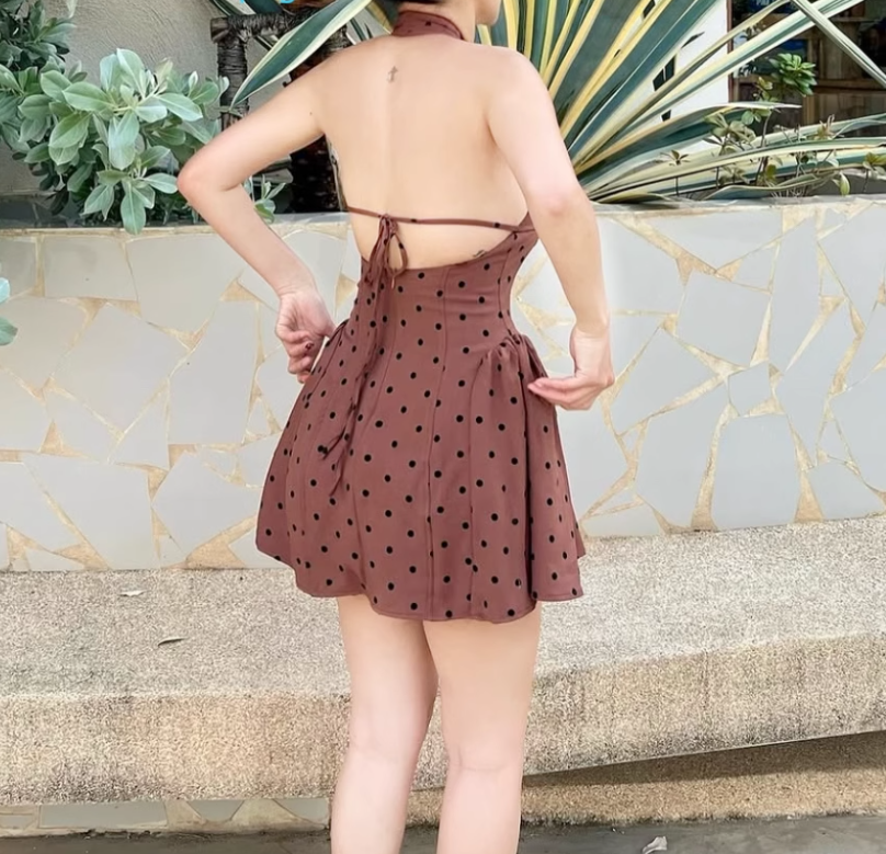 Fashionable sexy hot girl deep V flocked polka dot halter neck dress