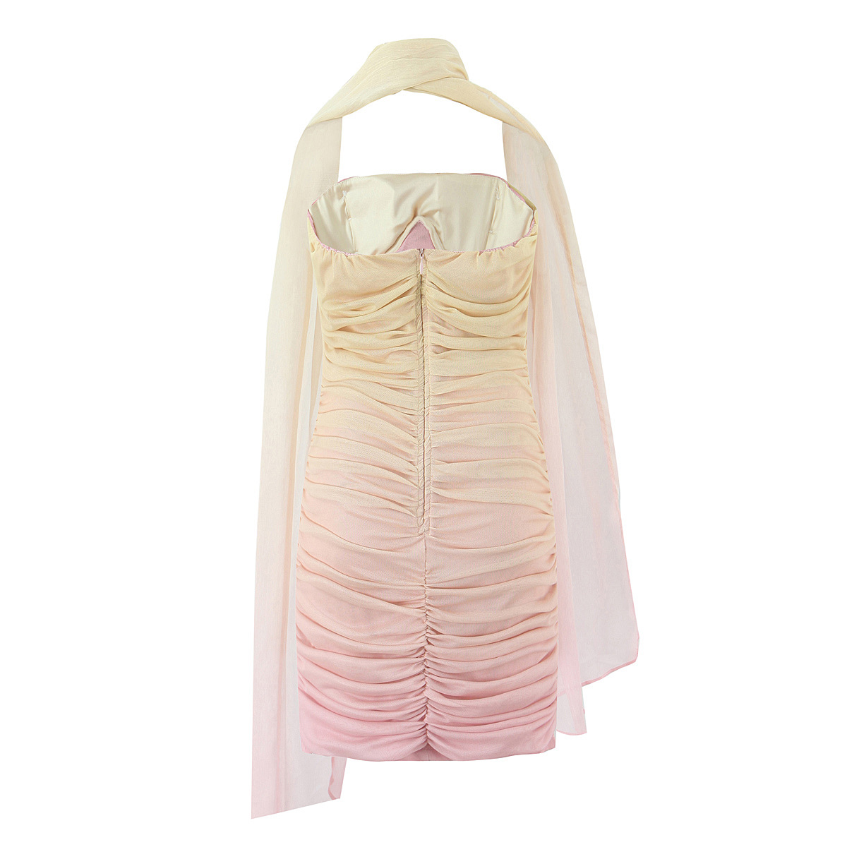 Gradient Pleated Tube Dress with Scarf Draped Neck Halter Dress