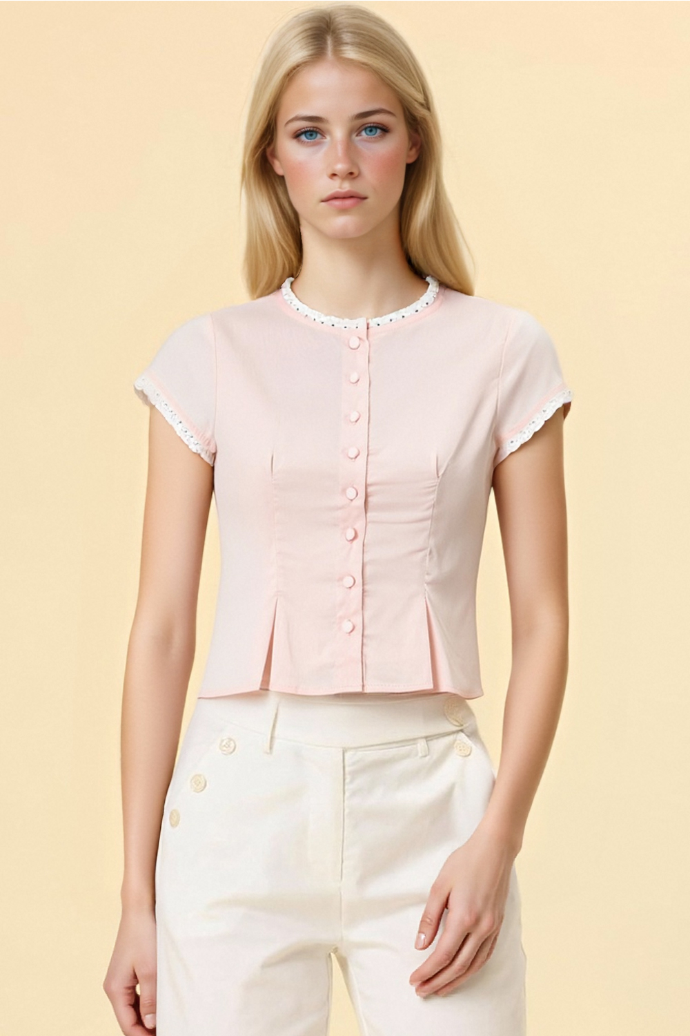 Retro and fresh slim fit round neck lace top with small flying sleeves