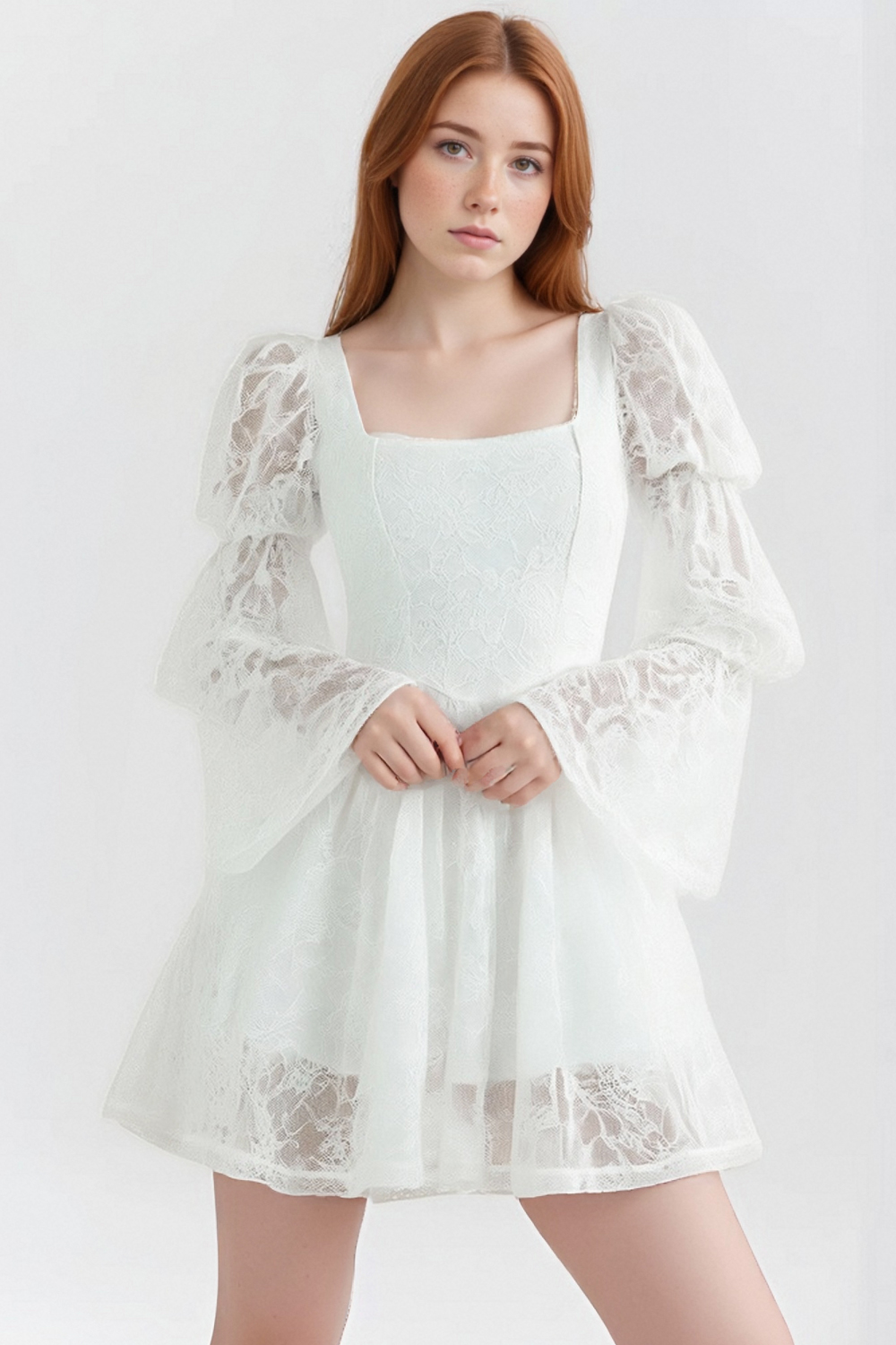 White lace flared long-sleeved square-neck dress with a slim waist and A-line skirt