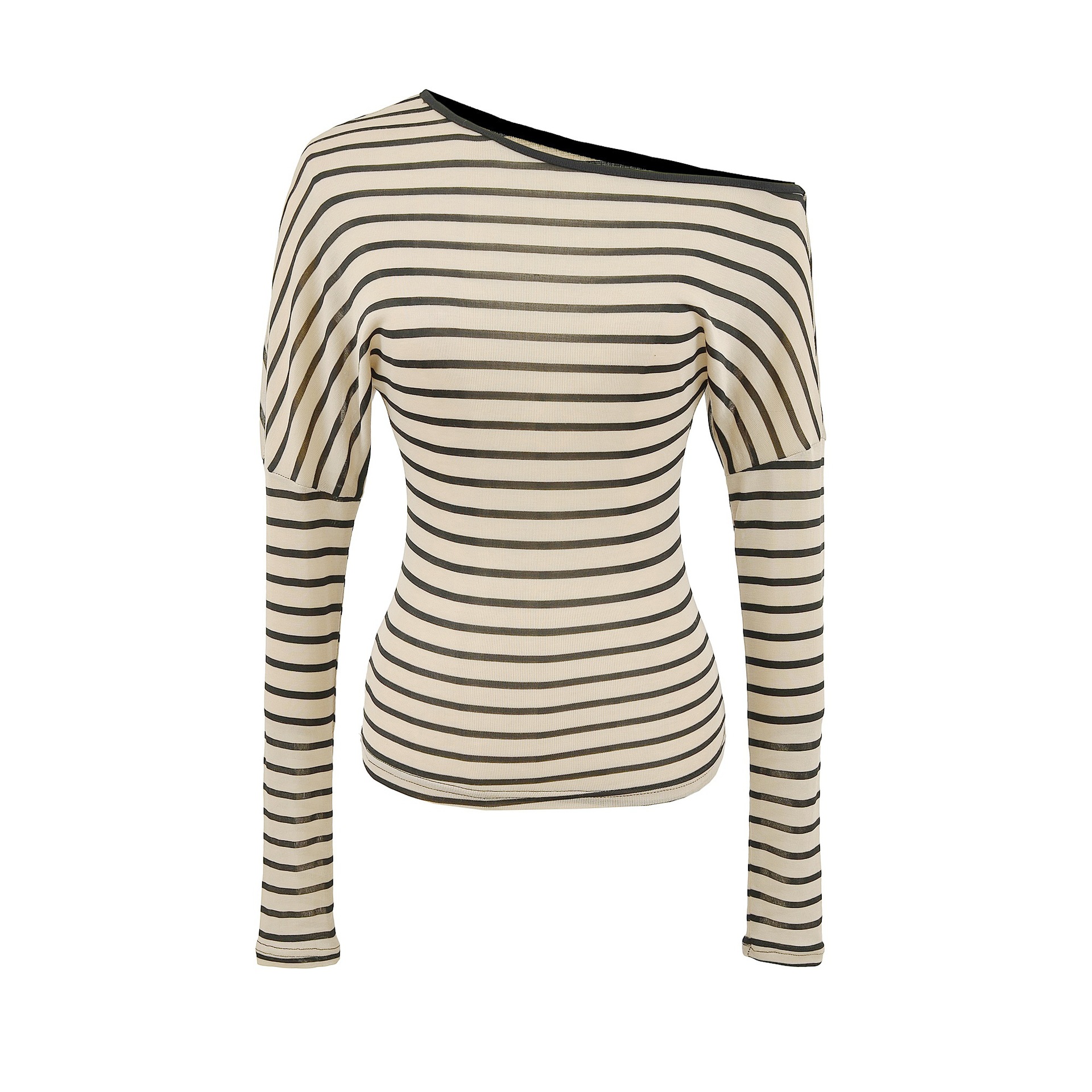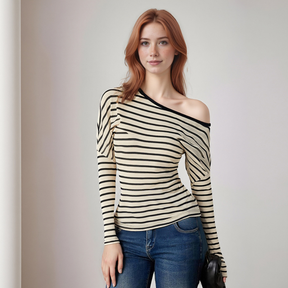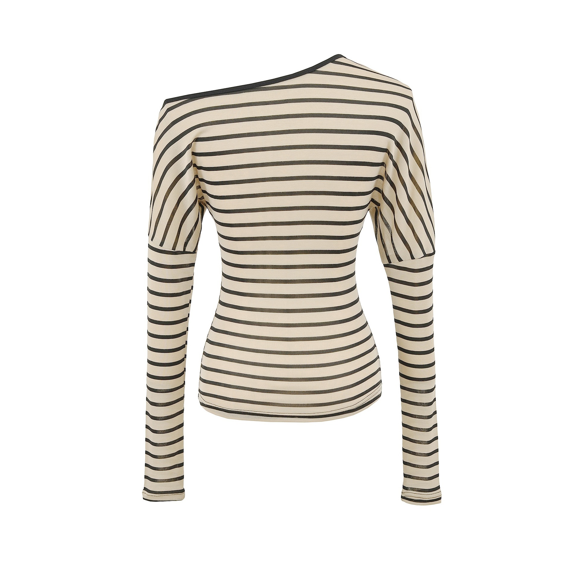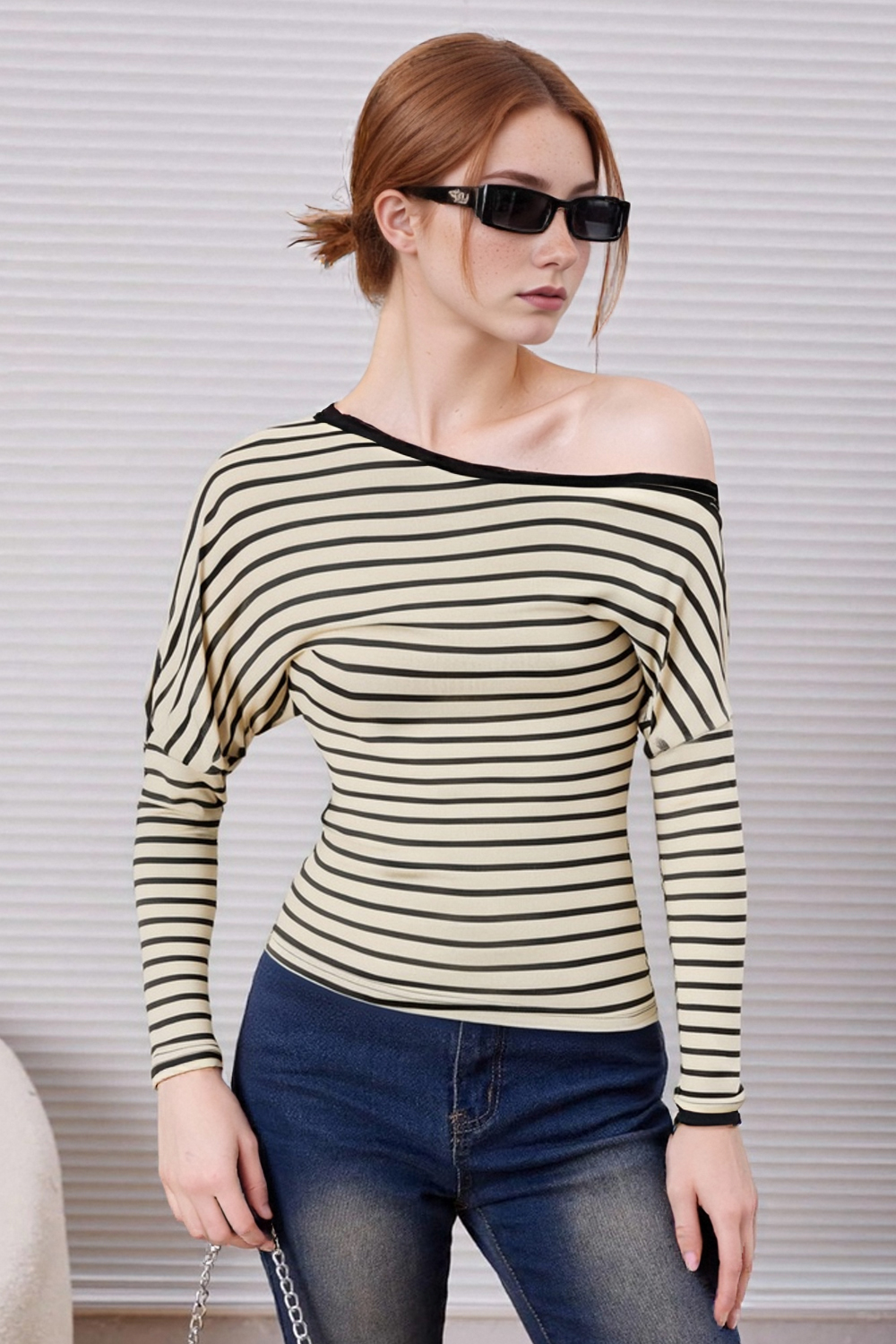 Sexy off-shoulder striped waist elastic slim long-sleeved T-shirt