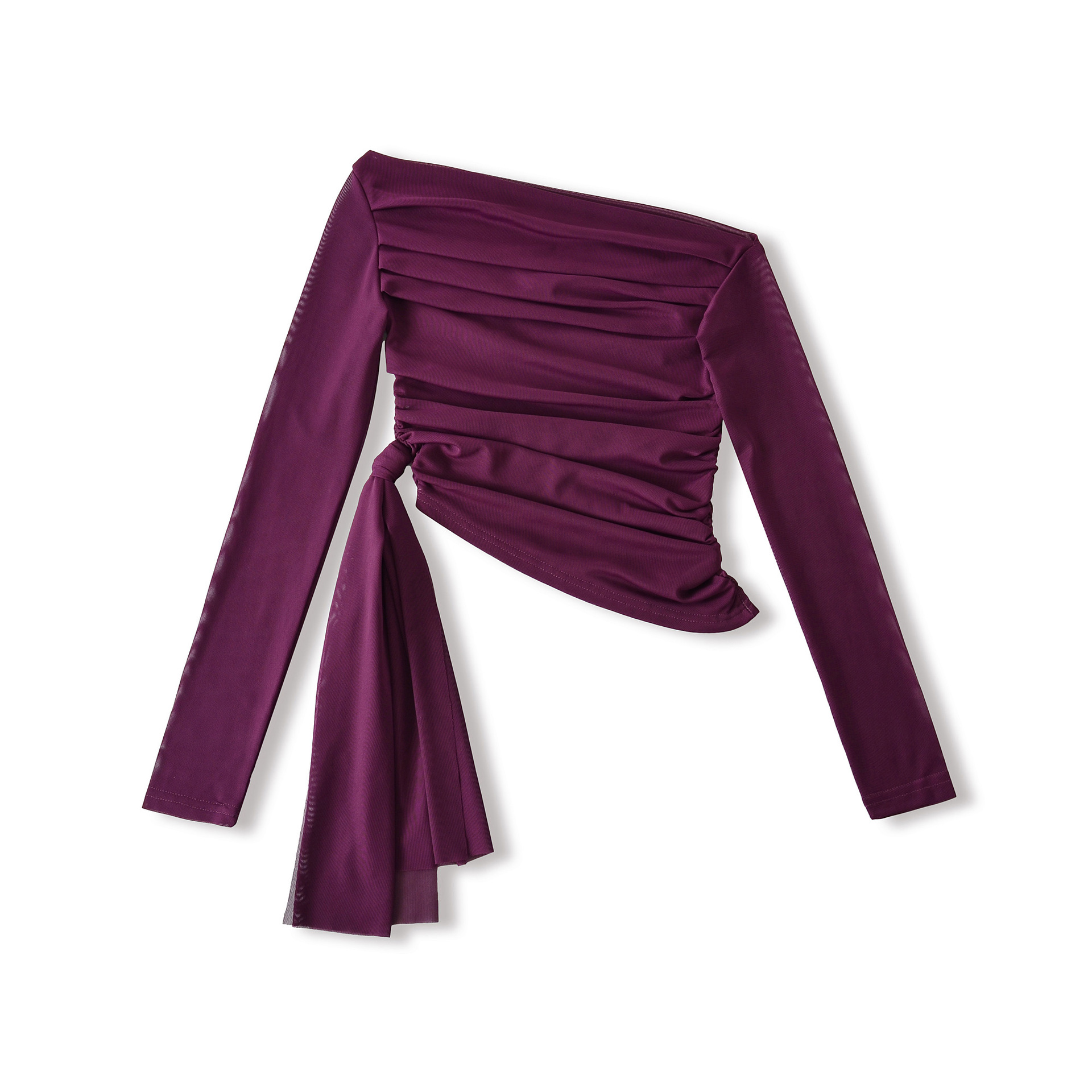 Mesh ribbon off-shoulder long-sleeved slim-fit T-shirt