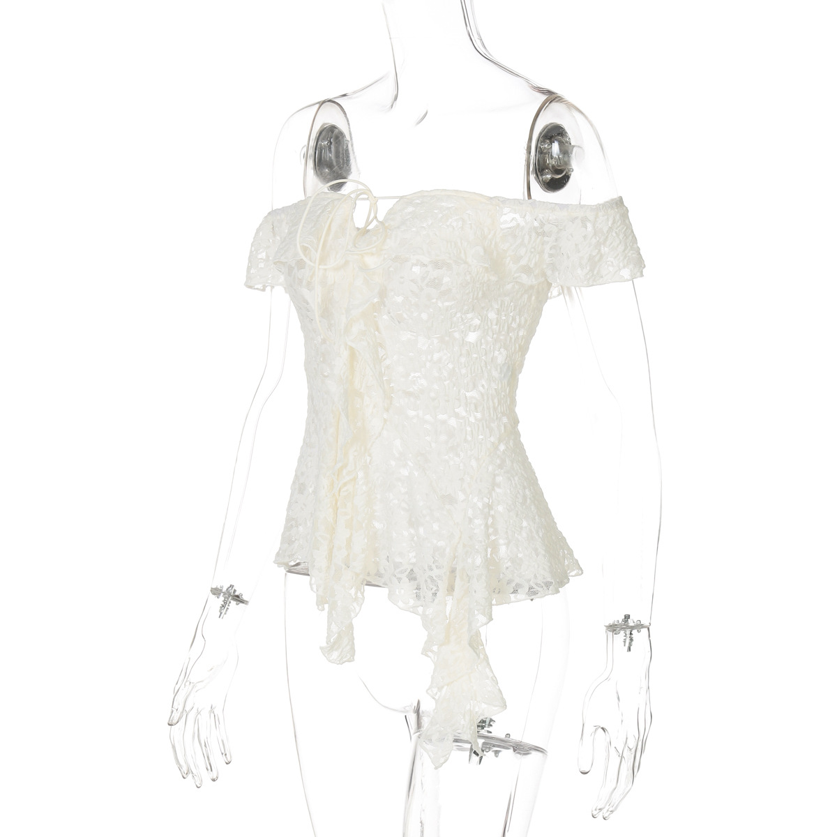 Irregular splicing ribbon women's lace lace-up one-shoulder top