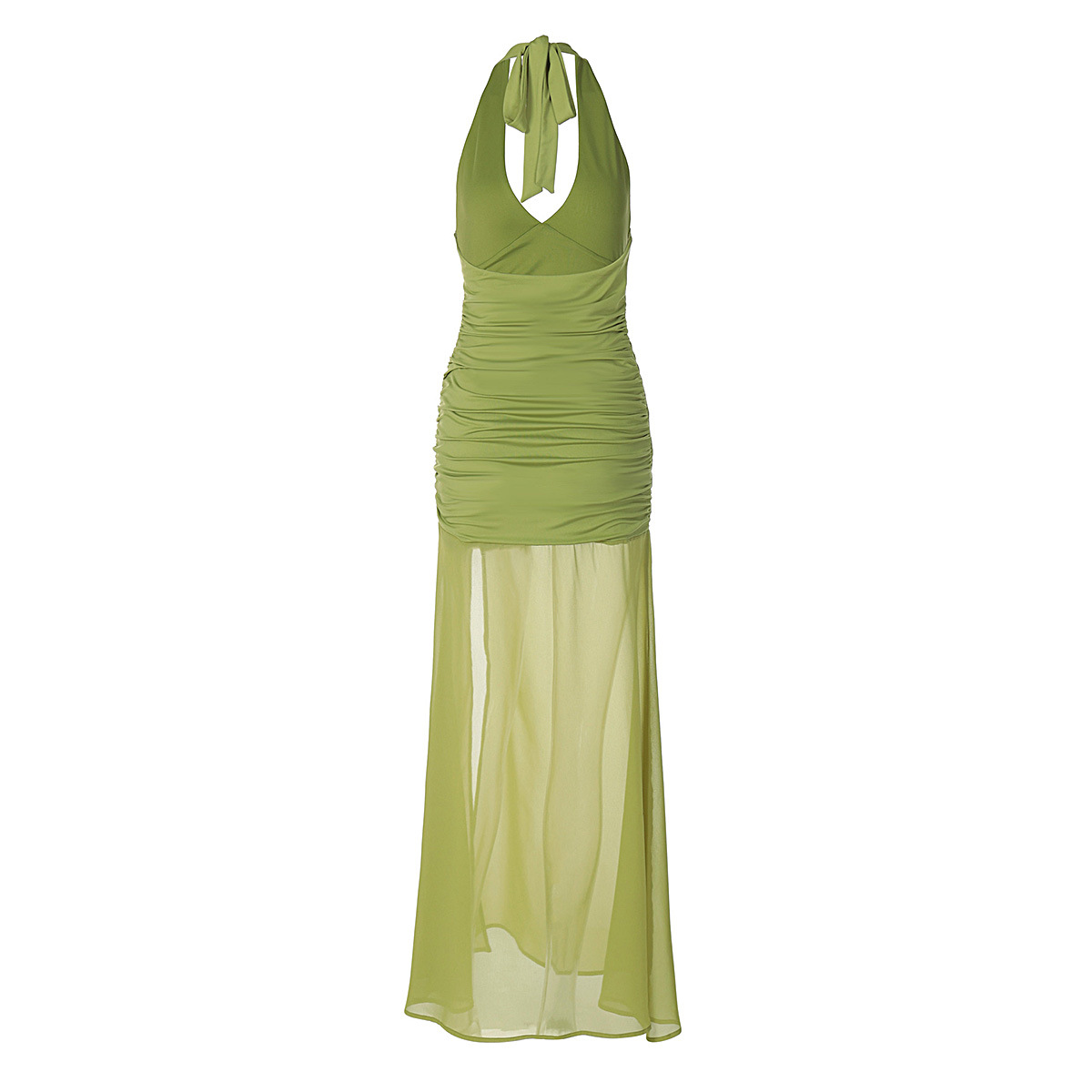 Sexy deep V waist pleated street style long mesh slit halterneck dress