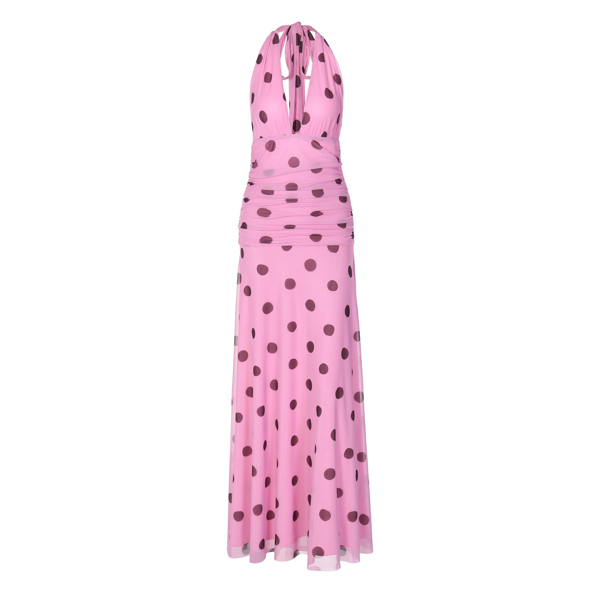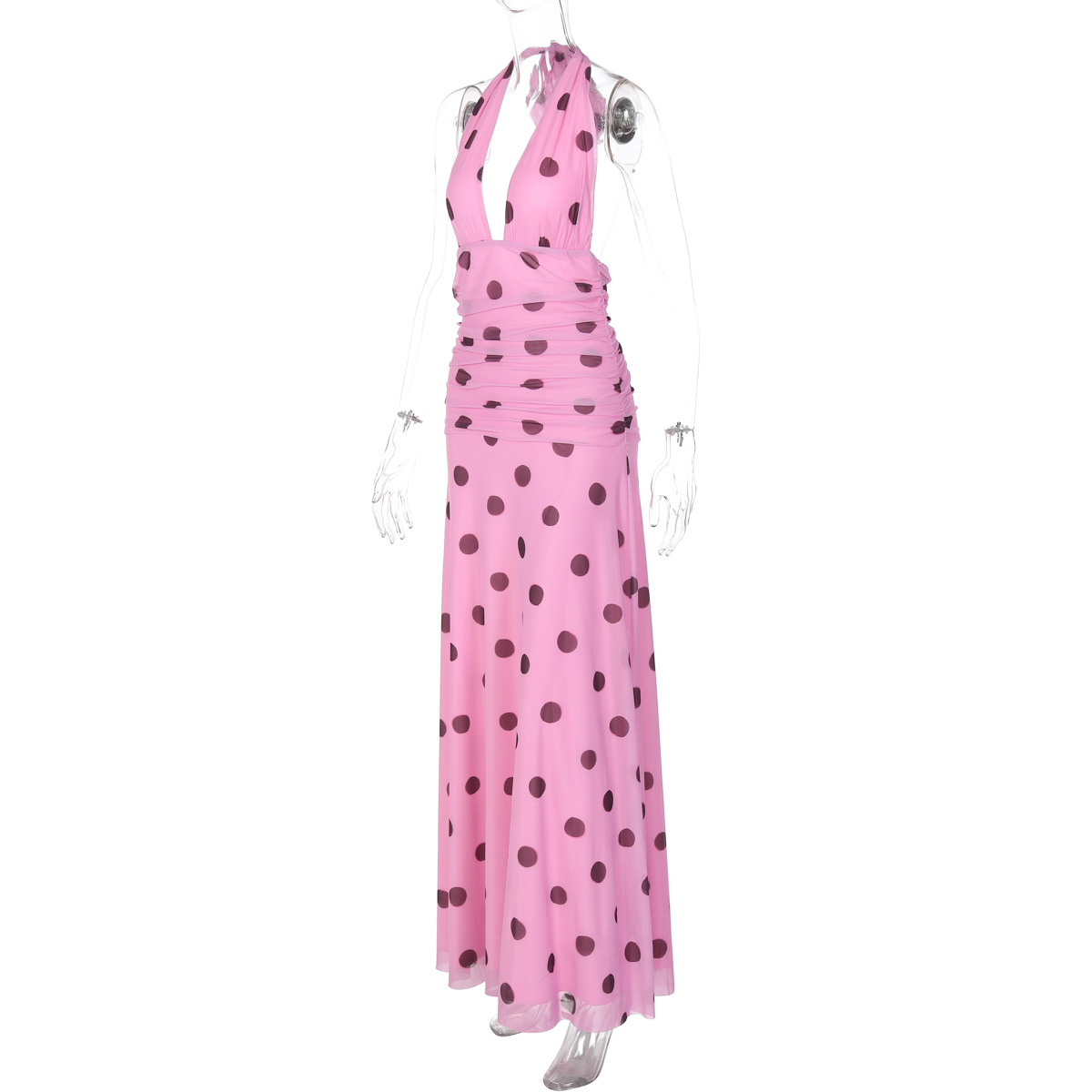 Women's holiday style polka dot V-neck halter dress with backless tie waist