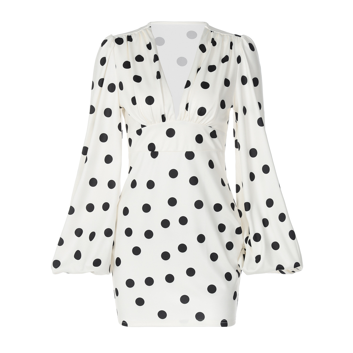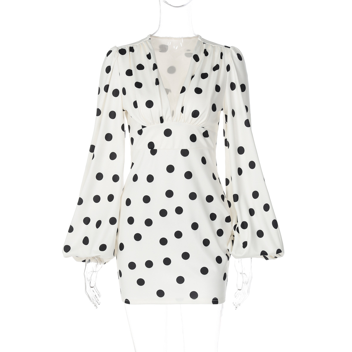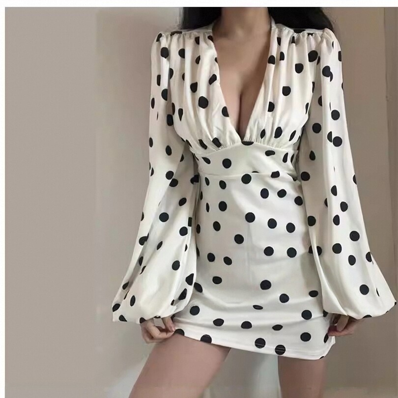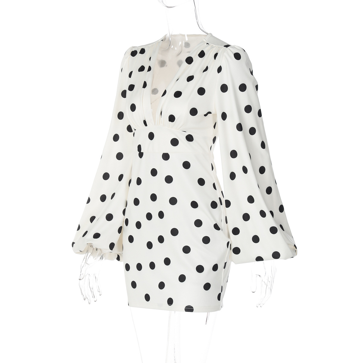 Fashionable Polka Dot Print Sexy Deep V Slim Flared Sleeve Hip Dress