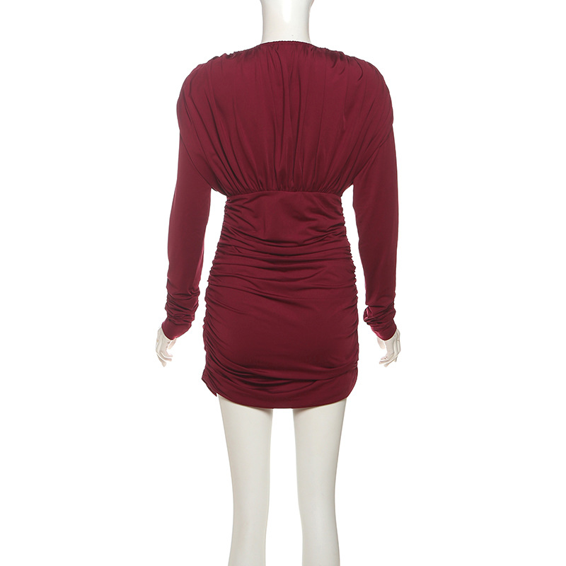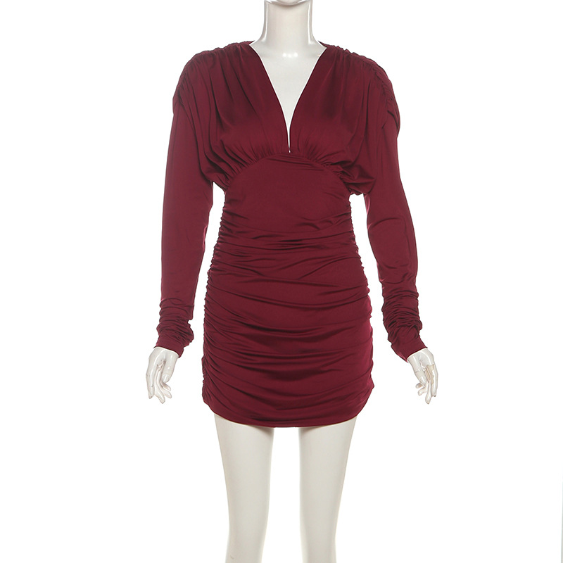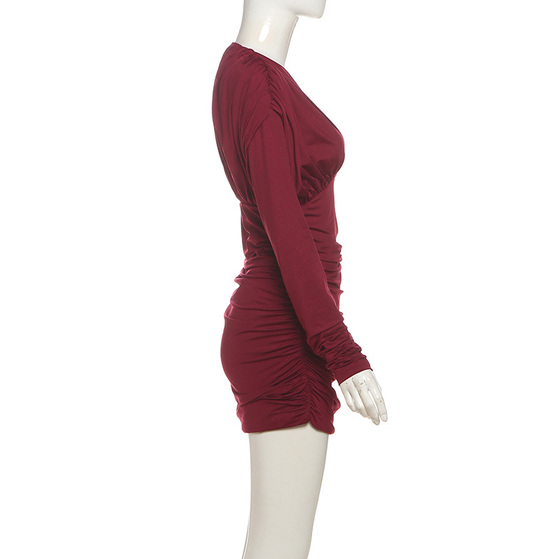 Solid color sexy slim hip-hugging V-neck high waist pleated long sleeve dress