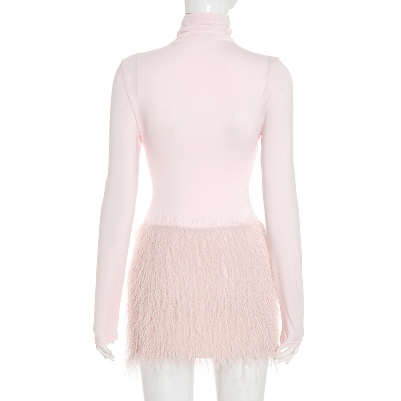 High-neck solid color long-sleeved slim-fit jumpsuit with tassels and a miniskirt