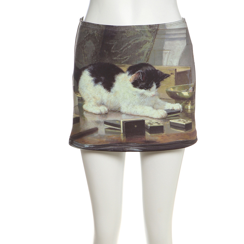 Fashionable and casual trendy naughty kitten print high waist hip skirt