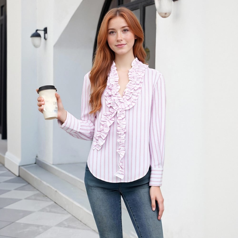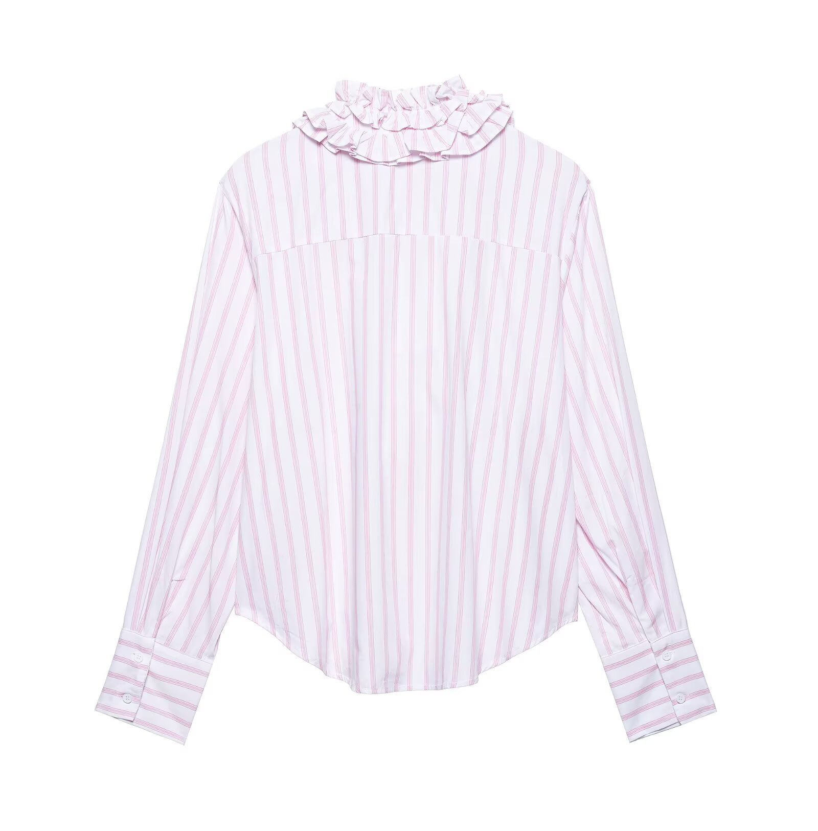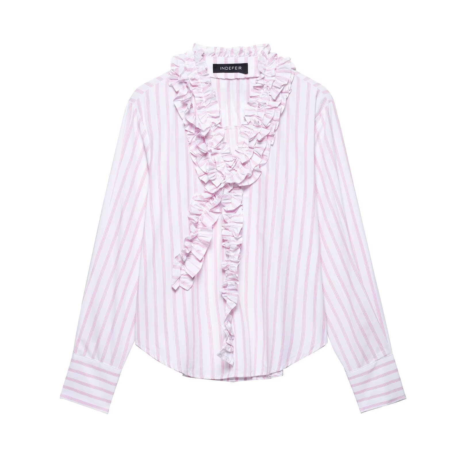 Fashionable French light pink three-dimensional ruffled V-neck striped shirt top