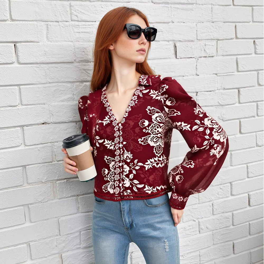 Simple casual ethnic style printed V-neck long-sleeved shirt