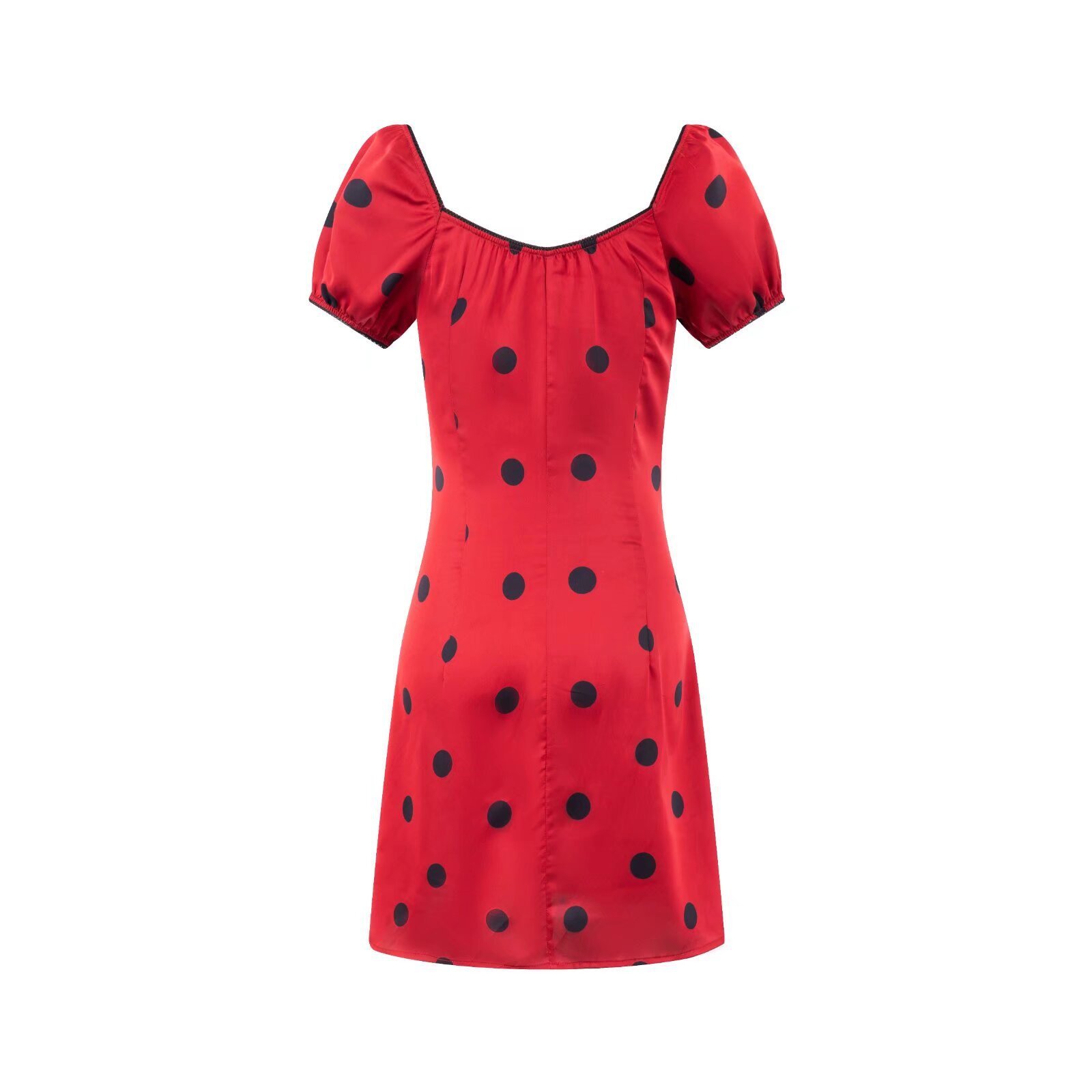 Red puff sleeve square neck dress with slim waist and polka dot short skirt