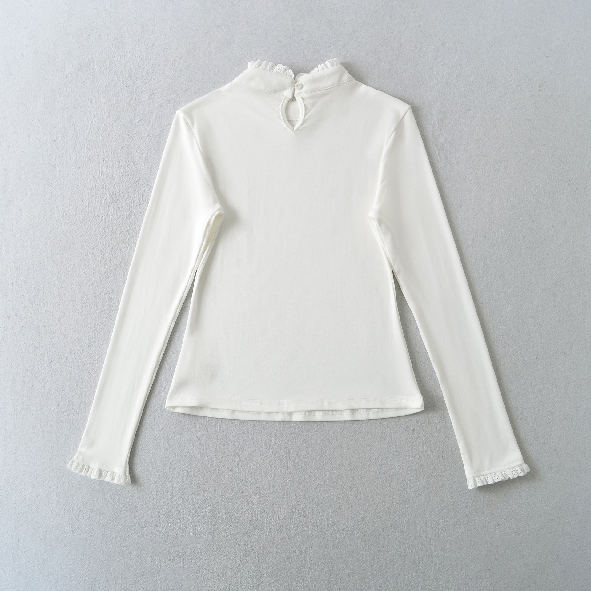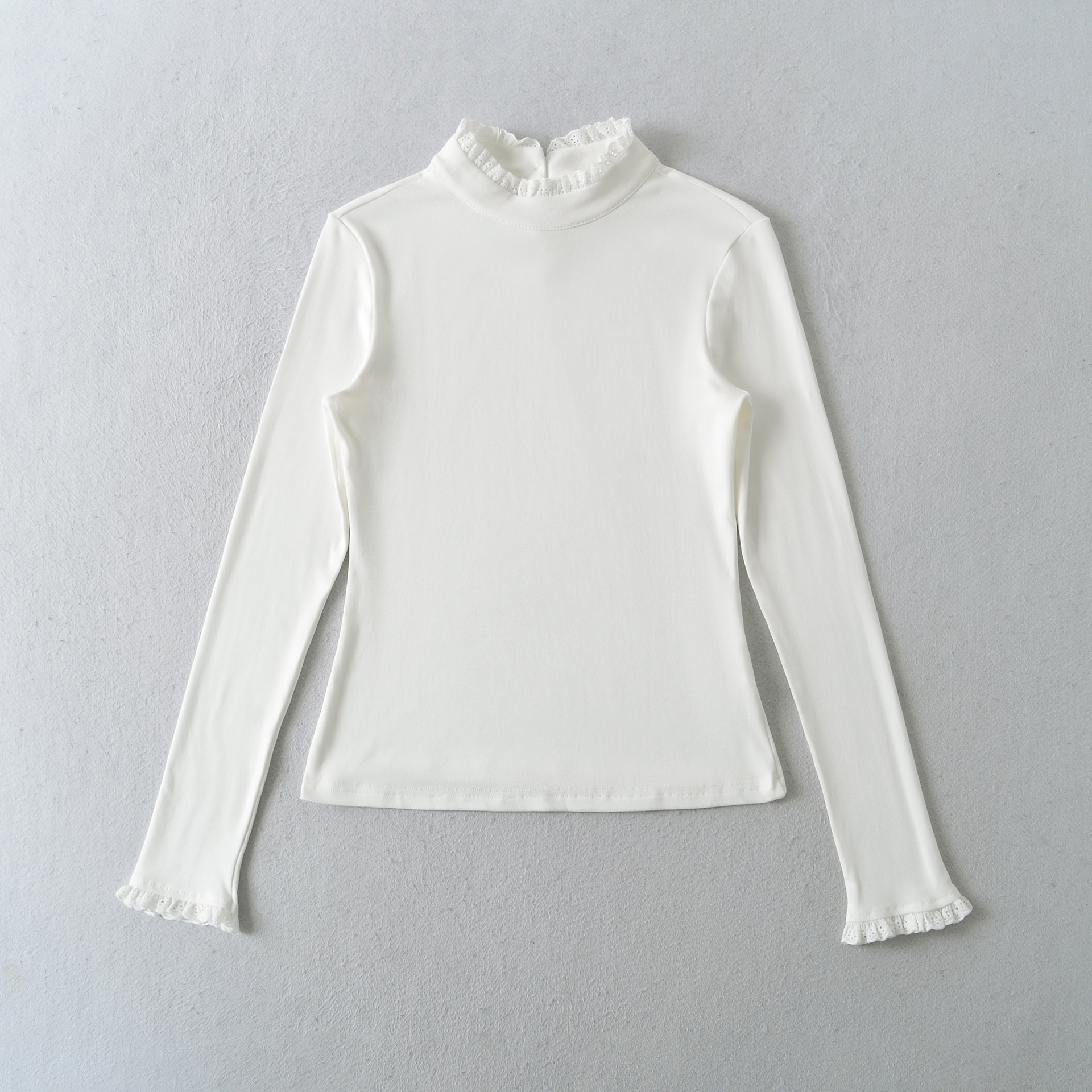 Lace-trimmed round neck long-sleeved slim-fit base layer T-shirt