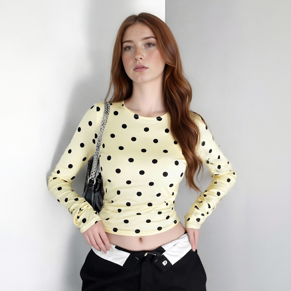 Round neck long sleeve polka dot print slim fit base layer T-shirt