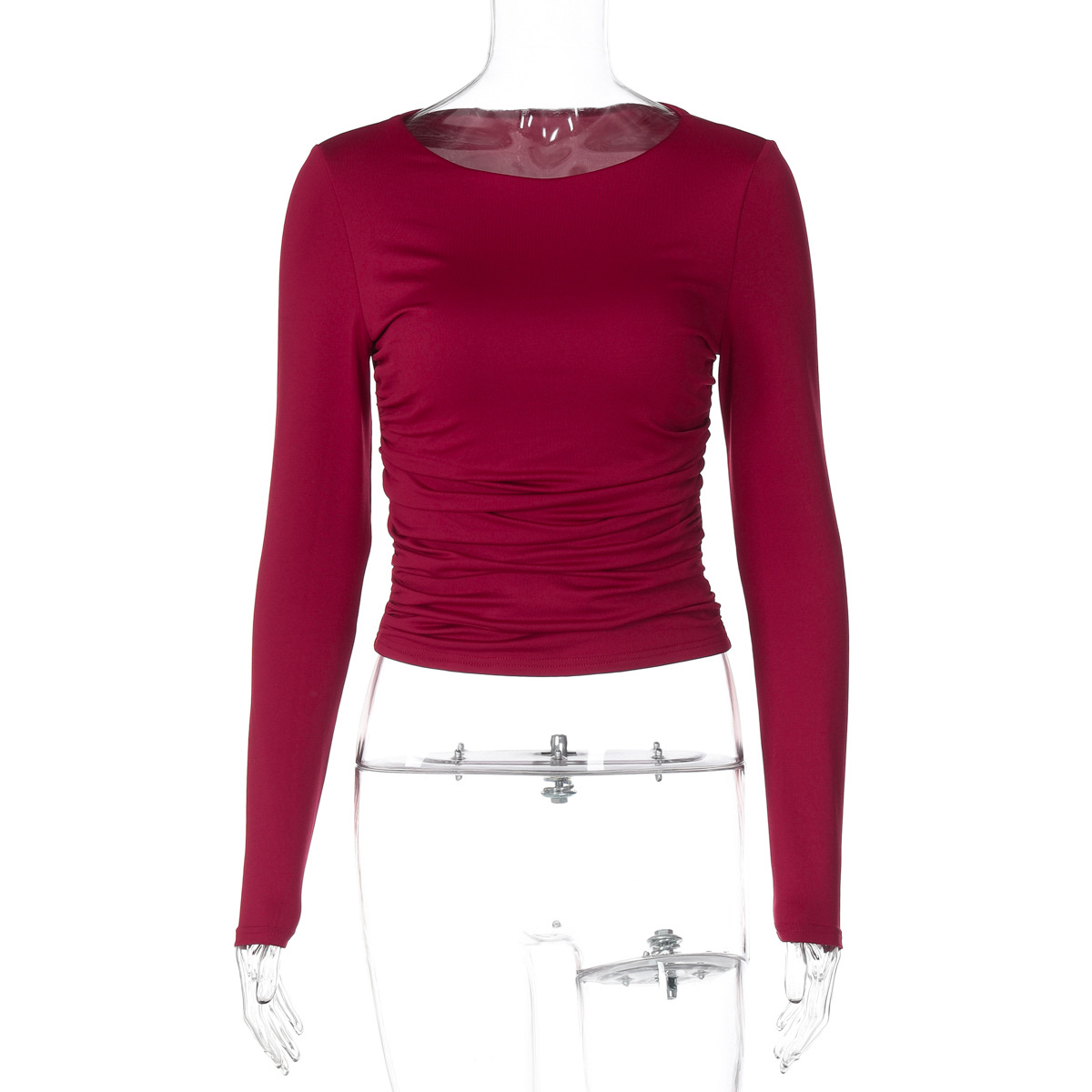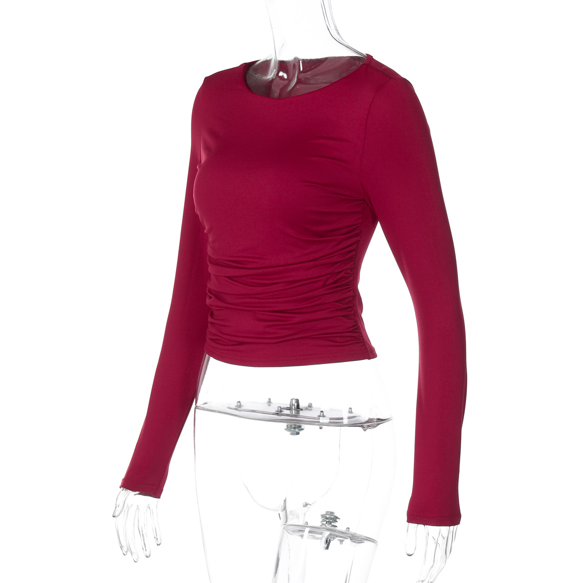 Solid color round neck long sleeve fashionable and trendy pleated slim fit T-shirt