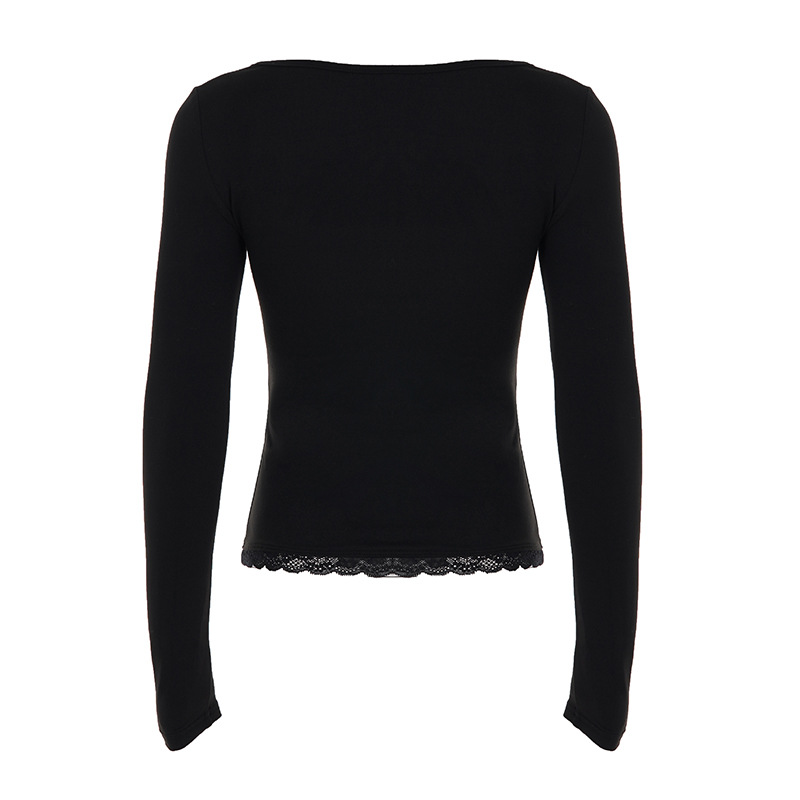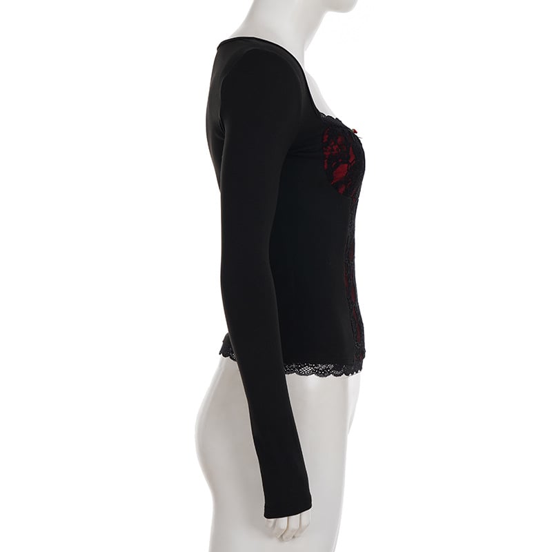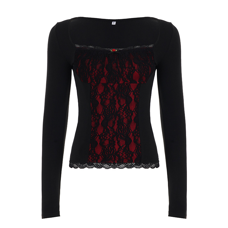 Dark color-blocked lace patchwork long-sleeved T-shirt