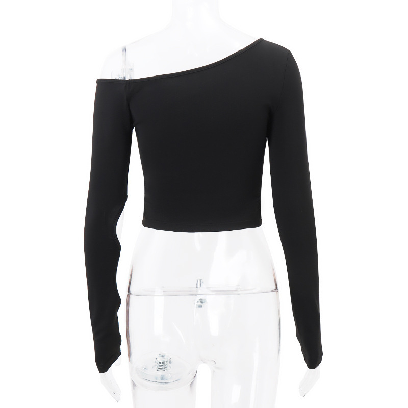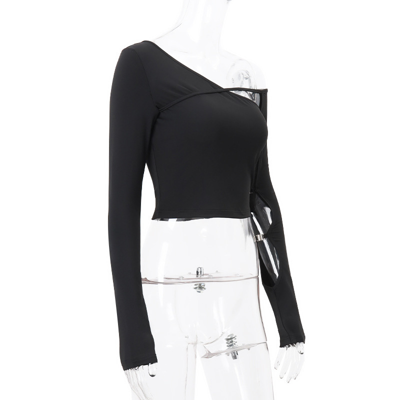 Street style slanted neck hollow cutout slim fit long sleeve top T-shirt