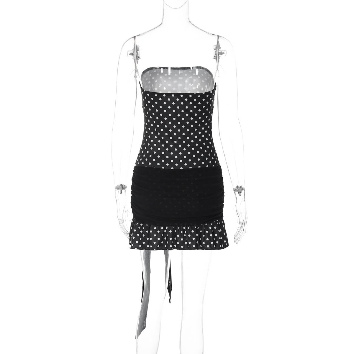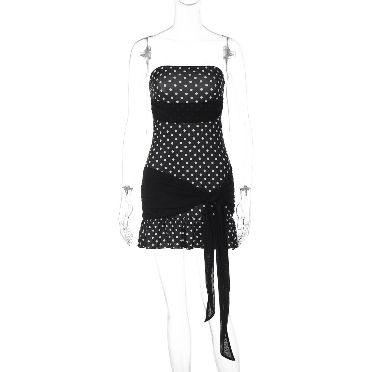 Fashionable polka dot print strapless dress with contrasting patchwork and tie-up details