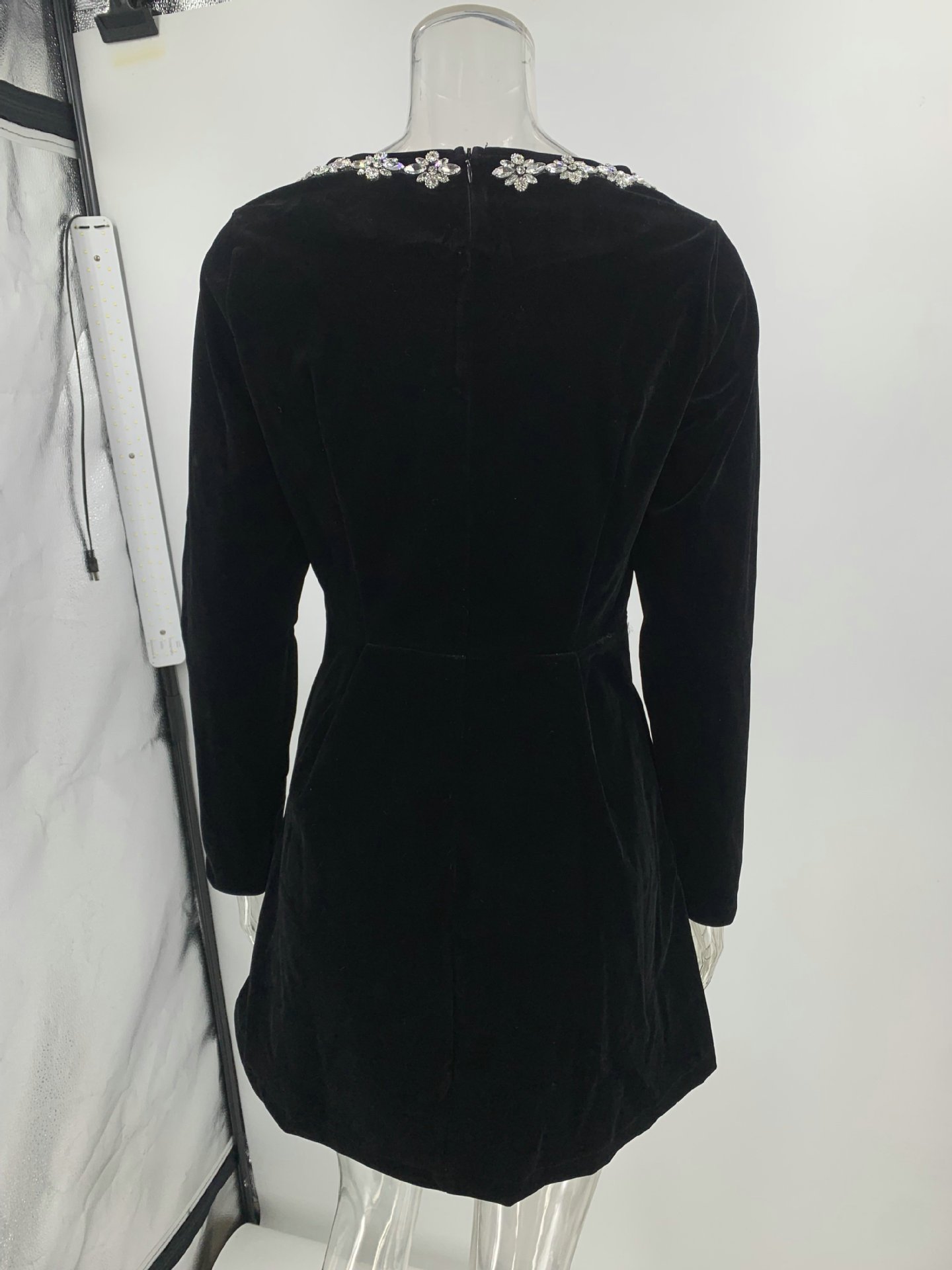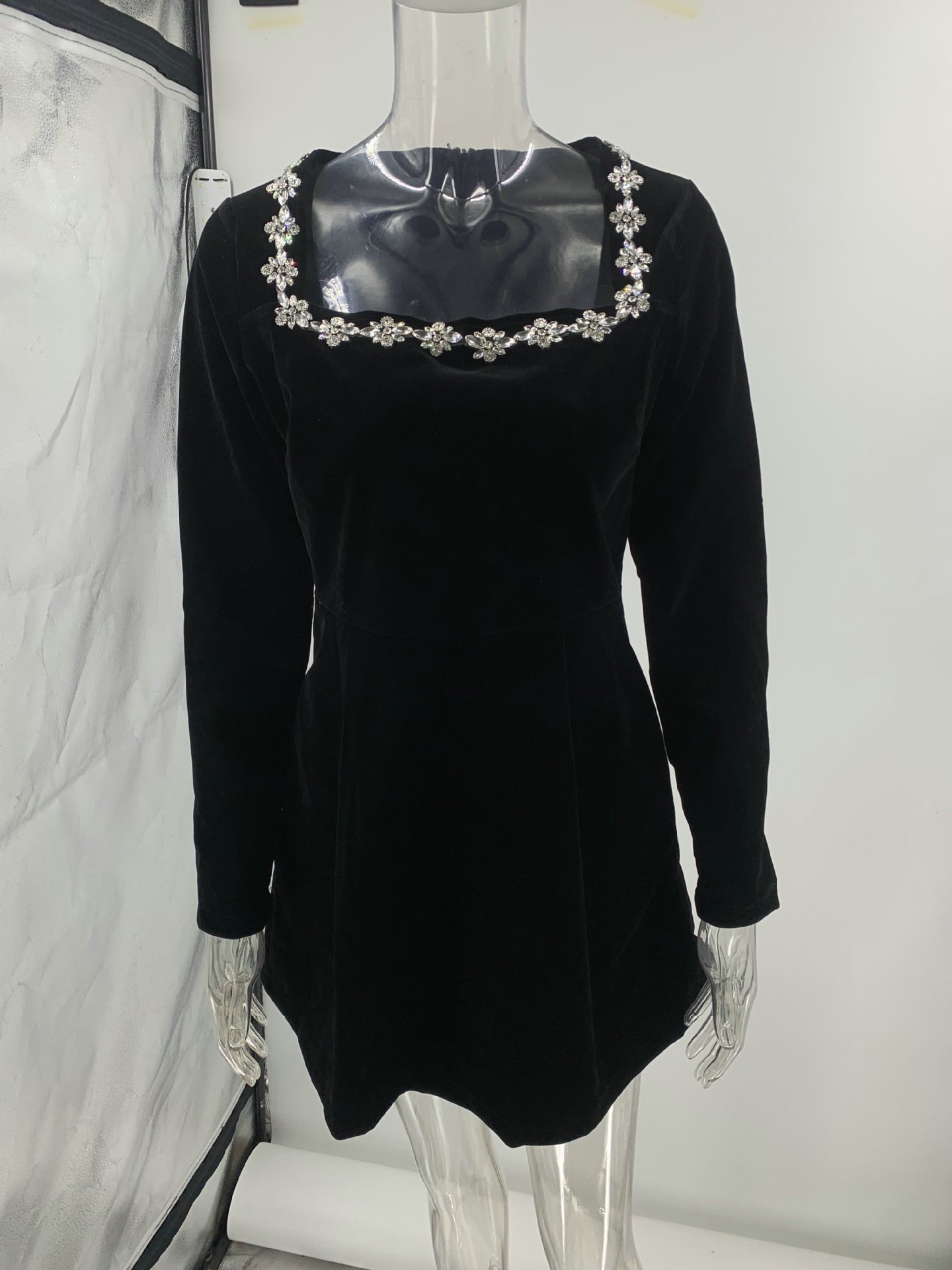 Elegant square-neck short velvet dress with rhinestone embellishments.