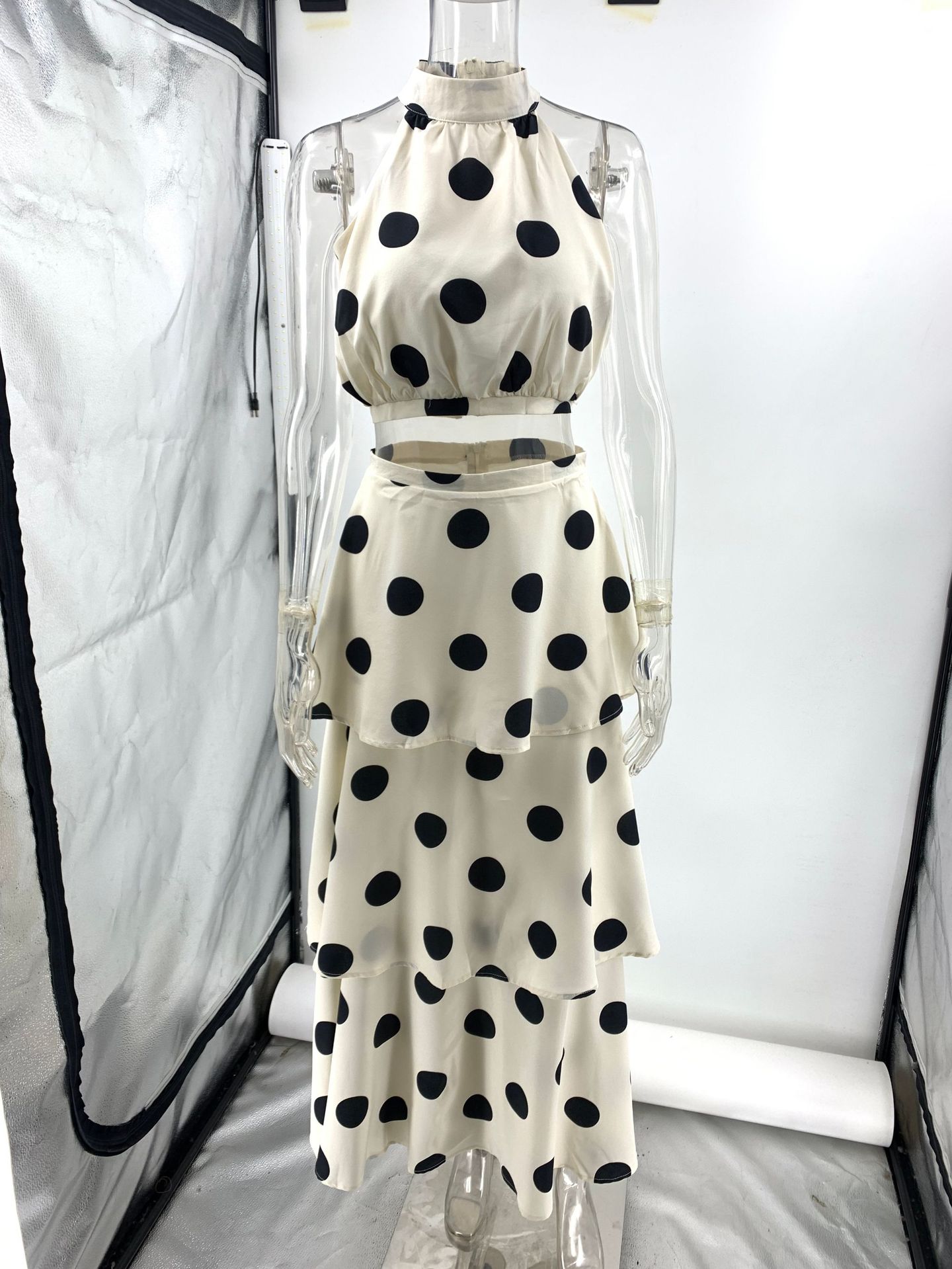 Polka dot print halter neck sleeveless top and tiered skirt set.