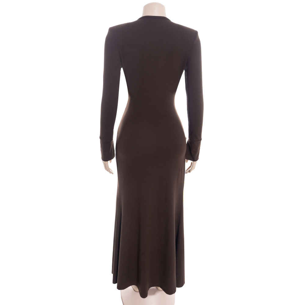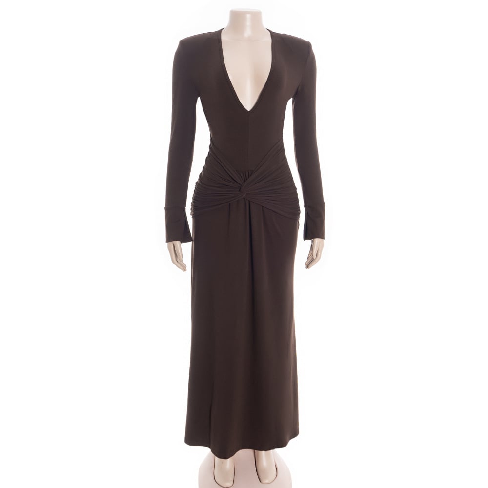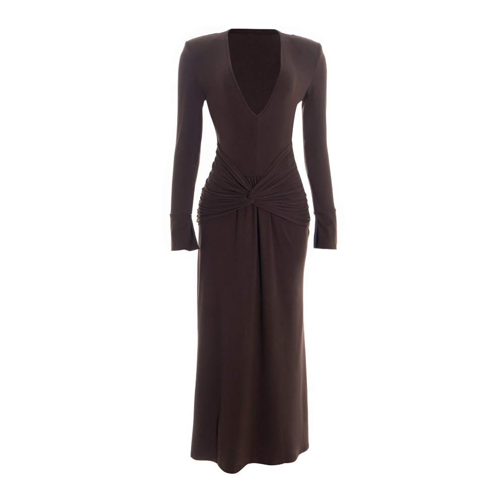 Deep V-neck, long-sleeved, sexy, ruched, solid-colored dress with tie-up detail.