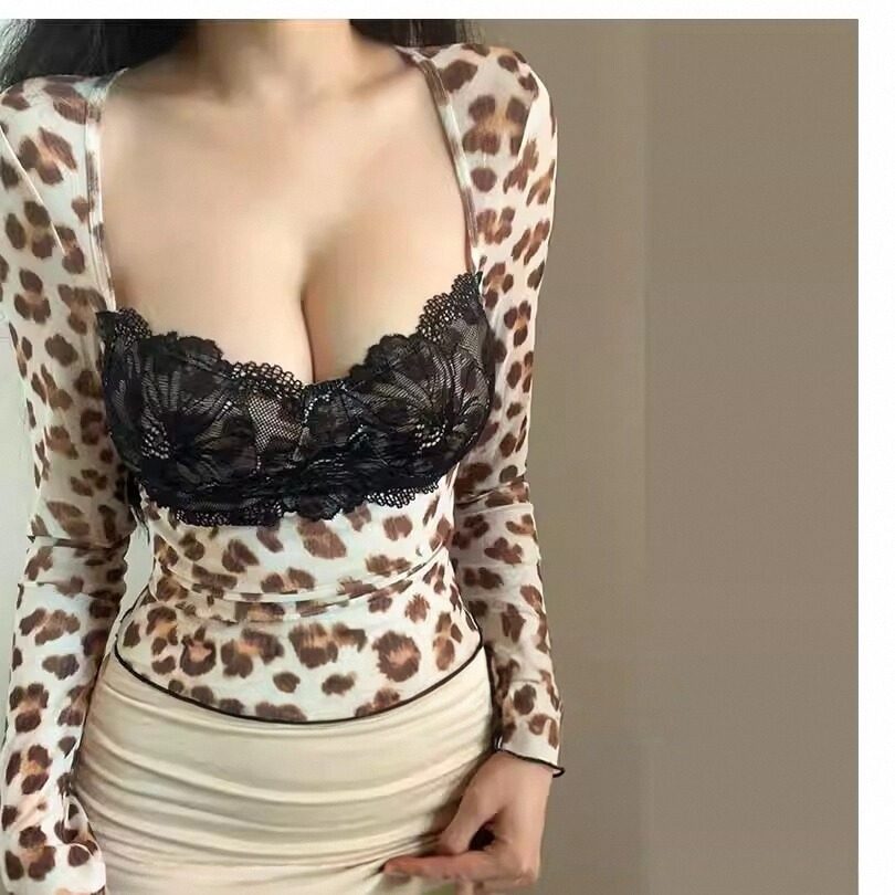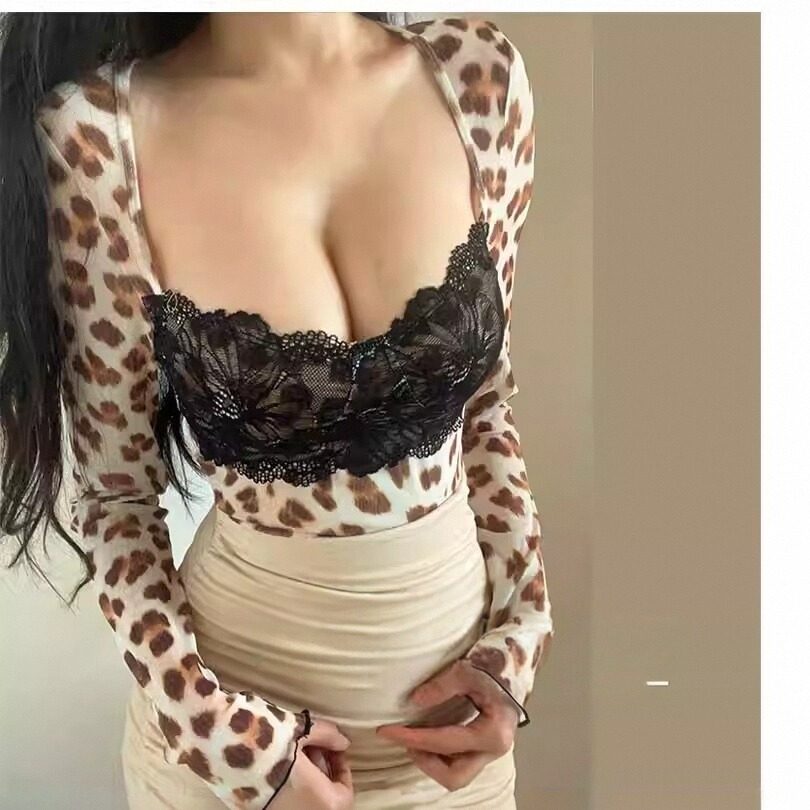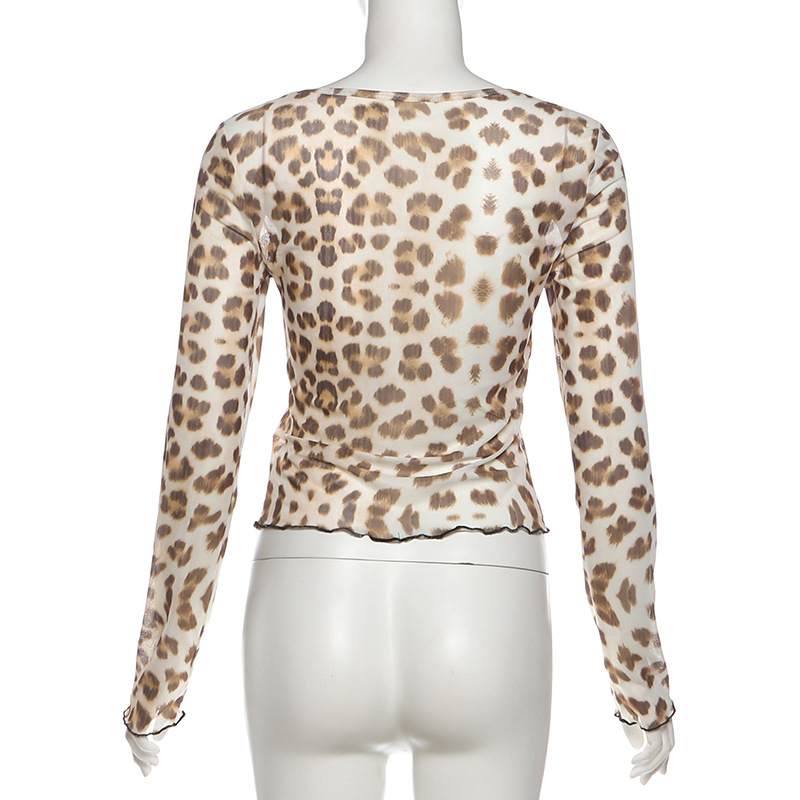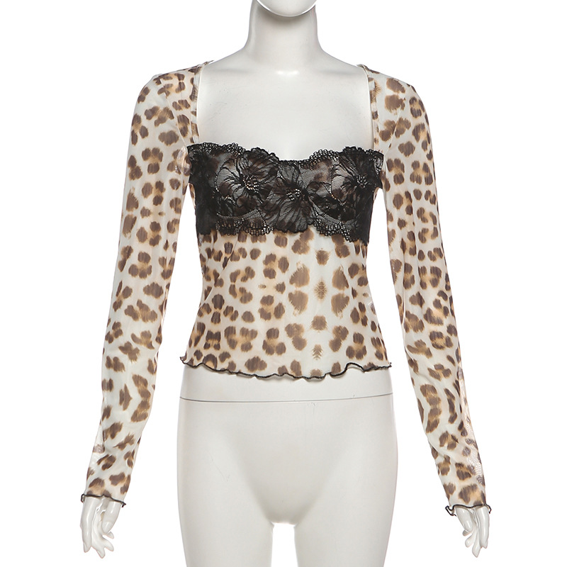 Sexy mesh top with leopard print design, contrasting lace trim, and cropped length.